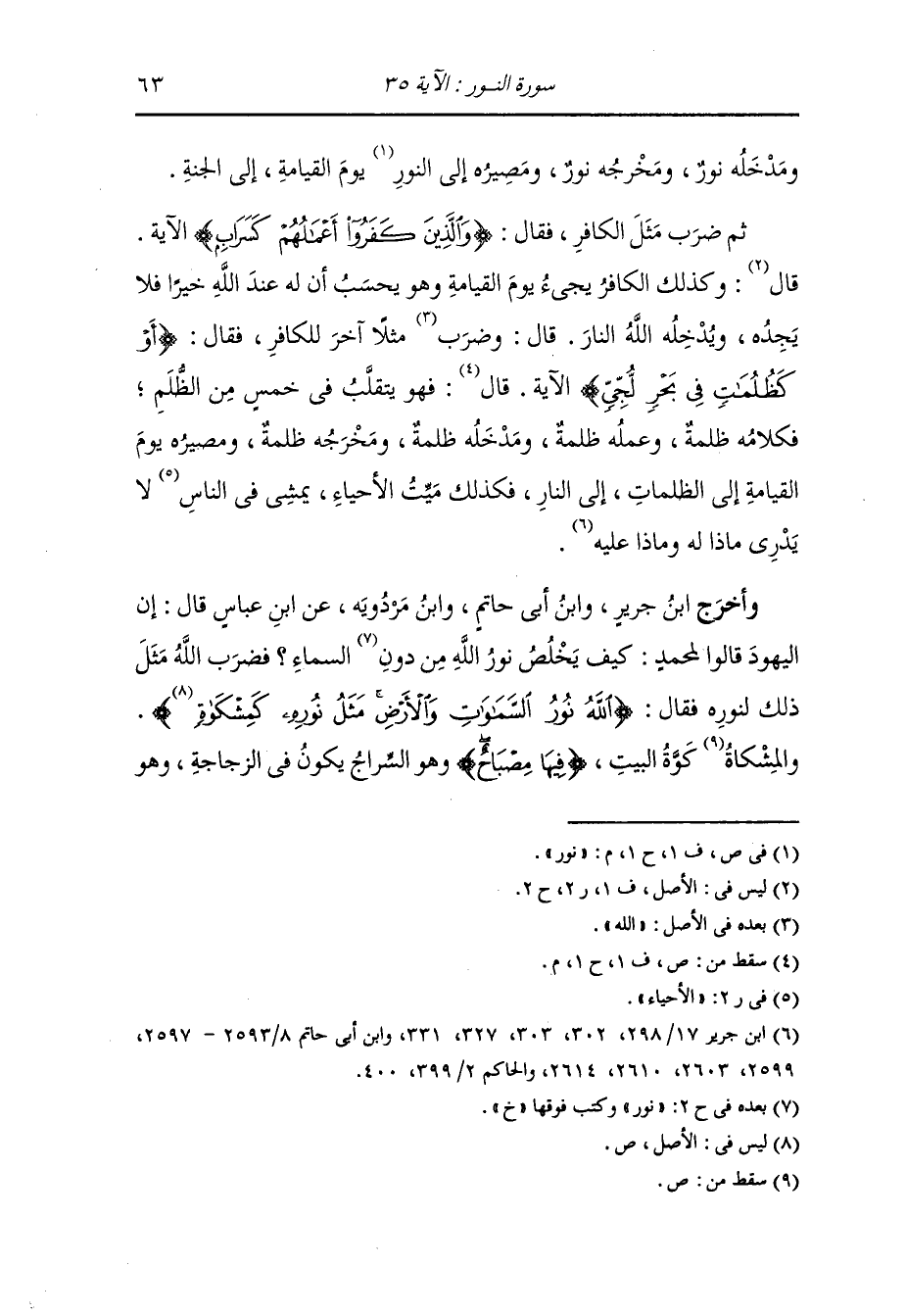 وأخرج ابن جرير ، وَابن أبي حاتم ، وَابن مردويه عن ابن عباس رضي الله عنهما قال : ان اليهود قالوا لمحمد : كيف يخلص نور الله من دون السماء فضرب الله مثل ذلك لنوره فقال {الله نور السماوات والأرض مثل نوره كمشكاة} والمشكاة : كوة البيت ، {فيها مصباح} وهو السراج يكون في الزجاجة ، وهو