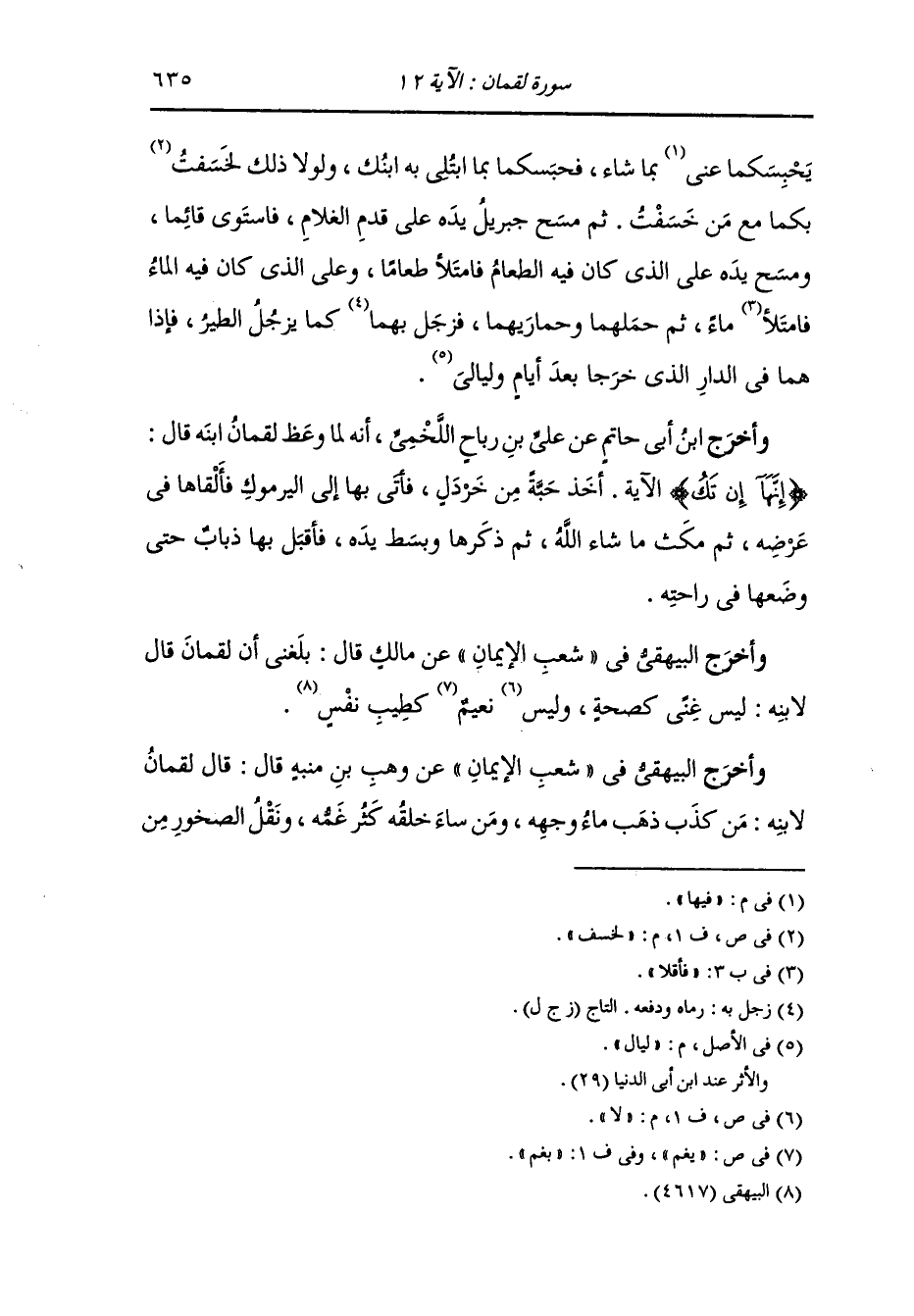 وأخرج ابن أبي شيبه وأحمد في الزهد والبيهقي عن الحسن رضي الله تعالى عنه ان لقمان قال لابنه : يا بني حملت الجندل ، والحديد ، وكل شيء ثقيل ، فلم أحمل شيئا هو أثقل من جار السوء وذقت المر فلم أذق شيئا هو أمر من الفقر يا بني لا ترسل رسولك جاهلا فان لم تجد حكيما فكن رسول نفسك يا بني اياك والكذب فانه شهي كلحم العصفور عما قليل يقلي صاحبه يا بني احضر الجنائز ولا تحضر العرس فان الجنائز تذكرك الآخرة والعرس تشهيك الدنيا يا بني لا تأكل شبعا على شبع فانك ان تلقه للكلب خير من أن تأكله يا بني لا تكن حلوا فتبلع ولا مرا فتلفظ.