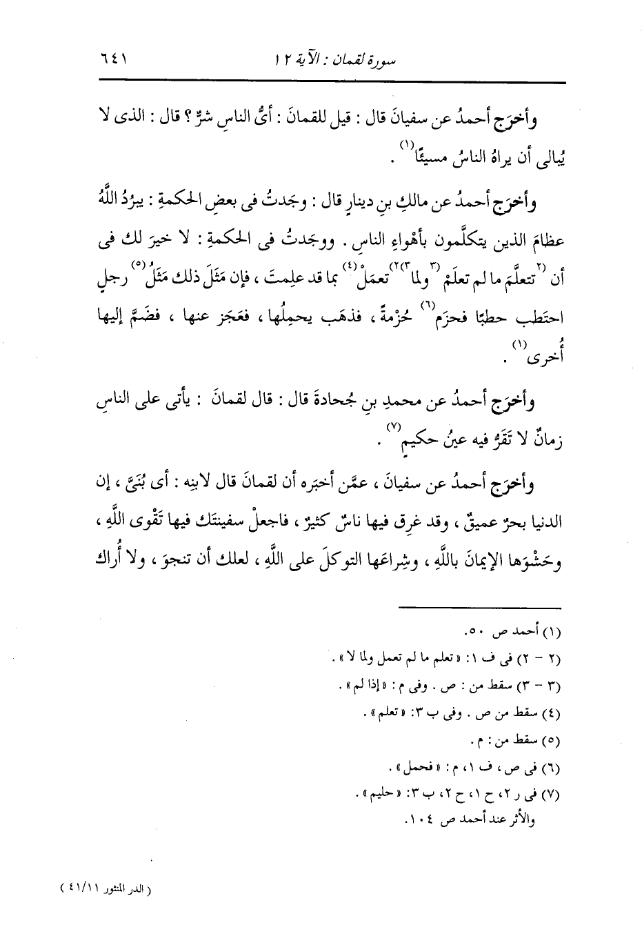 وأخرج أحمد عن شرحبيل بن مسلم رضي الله عنه ان لقمان قال : أقصر من اللجاجة ولا أنطق فيما لا يعنيني ولا أكون مضحاكا من غير عجب ولا مشاء إلى غير أرب.