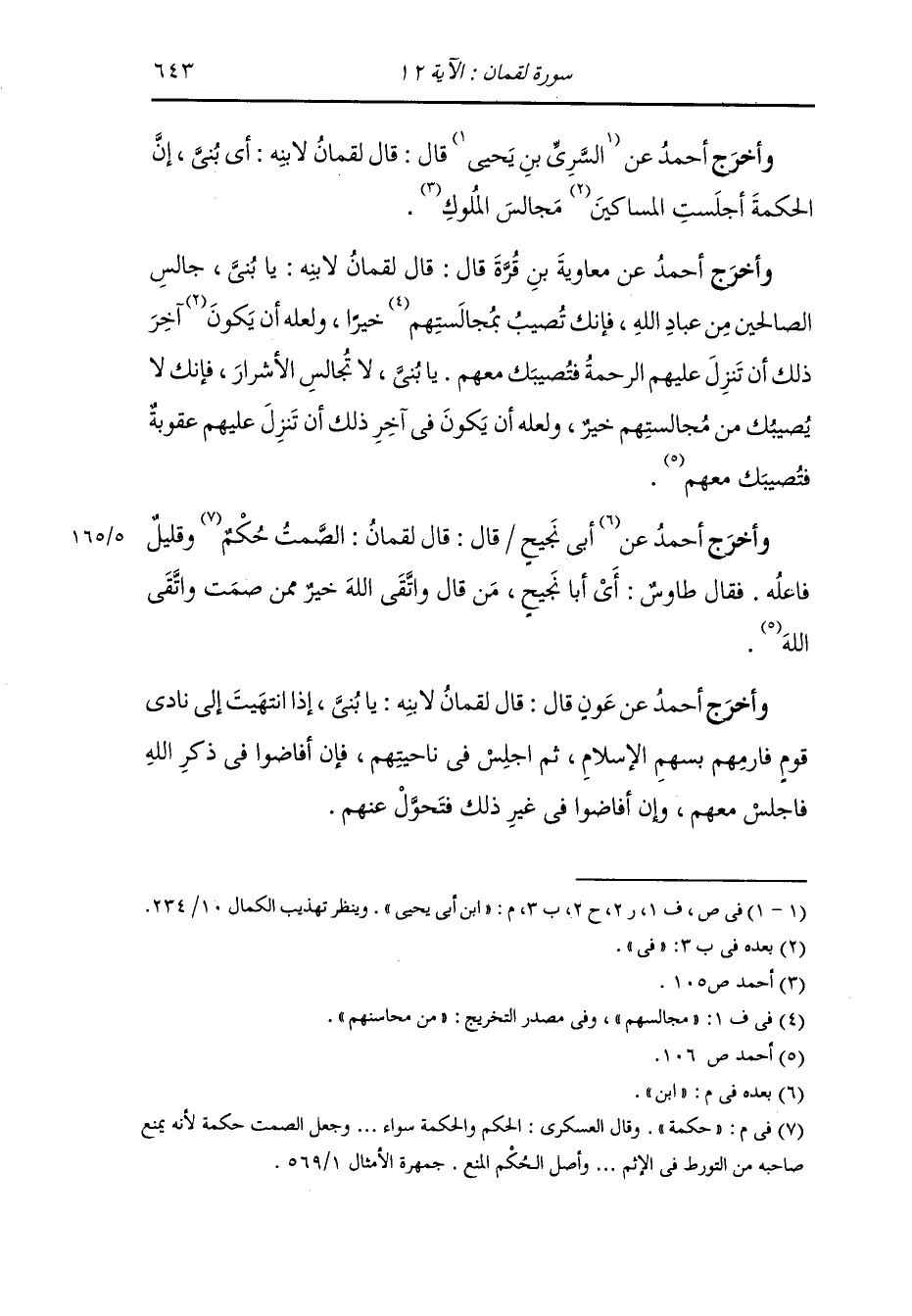 وأخرج عبد الله في زوائده عن عبد الوهاب بن بخت المكي رضي الله تعالى عنه قال : قال لقمان عليه السلام لابنه : يا بني جالس العلماء وزاحمهم بركبتيك فان الله ليحيي القلوب الميتة بنور الحكمة كما يحيي الأرض الميتة بوابل السماء.