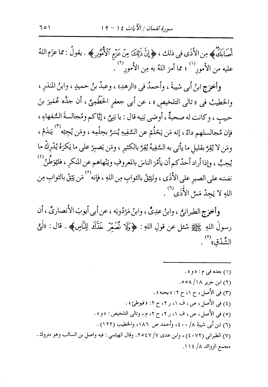 وأخرج ابن المنذر ، وَابن أبي حاتم والبيهقي في شعب الايمان عن الربيع بن أنس رضي الله عنه في قوله {ولا تصعر خدك للناس} قال : ليكن الفقير والغني عندك في العلم سواء وقد عوتب النَّبِيّ صلى الله عليه وسلم {عبس وتولى}.