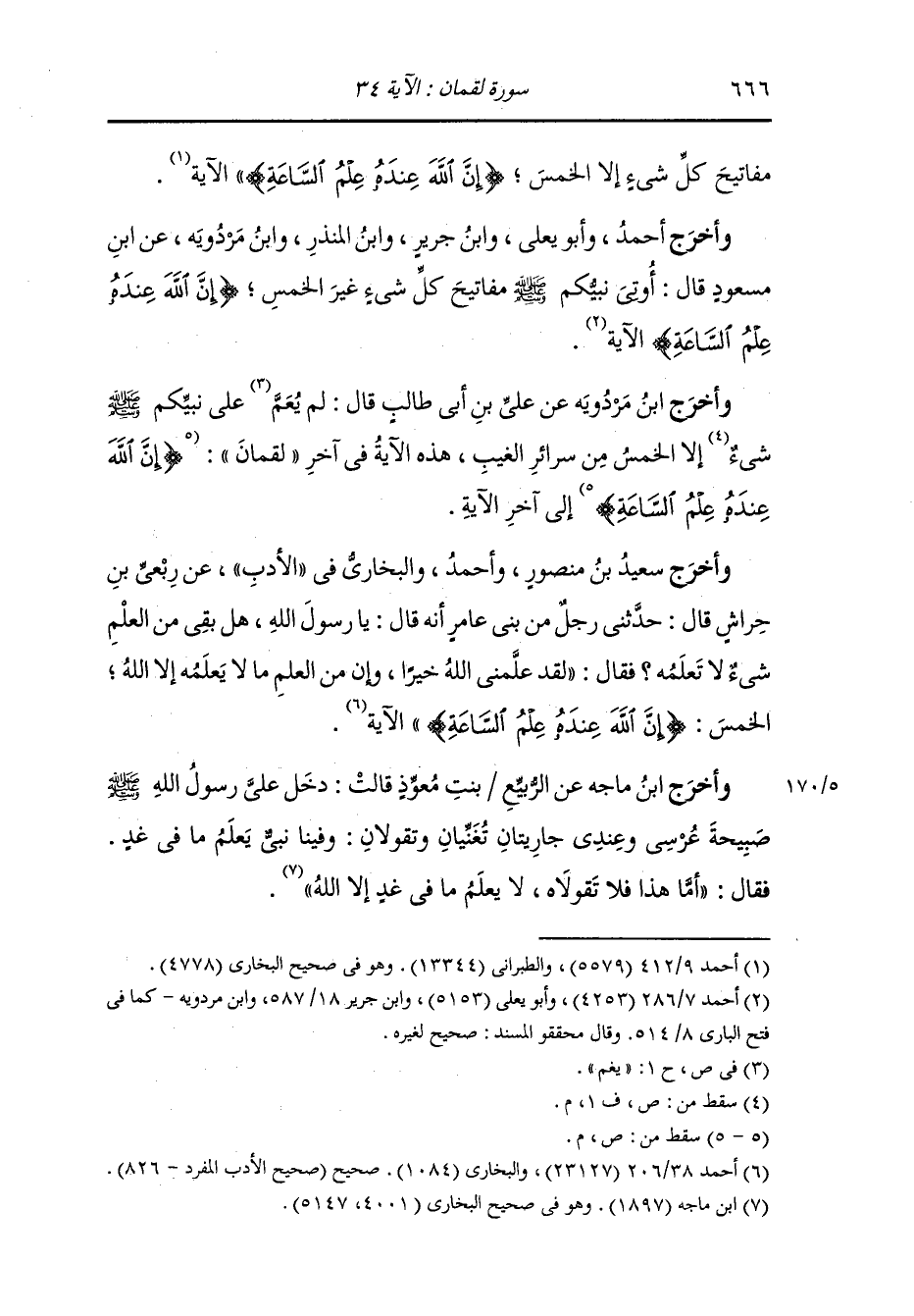 فاذا فعلت ذلك فقد آمنت قال : نعم ، ثم قال : ما الإحسان قال : أن تعبد الله كأنك تراه فإن كنت لا تراه فهو يراك قال : فاذا فعلت ذلك فقد أحسنت قال : نعم ، قال : فمتى الساعة يا رسول الله فقال رسول الله صلى الله عليه وسلم ك سبحان الله ، خمس لا يعلمها إلا الله {إن الله عنده علم الساعة وينزل الغيث ويعلم ما في الأرحام وما تدري نفس ماذا تكسب غدا وما تدري نفس بأي أرض تموت إن الله عليم خبير}.