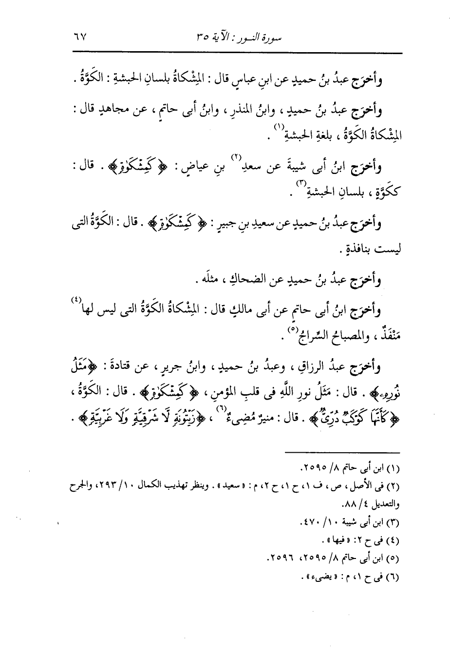 وأخرج عَبد بن حُمَيد عن ابن عباس رضي الله عنهما قال : المشكاة بلسان الحبشة ، الكوة.