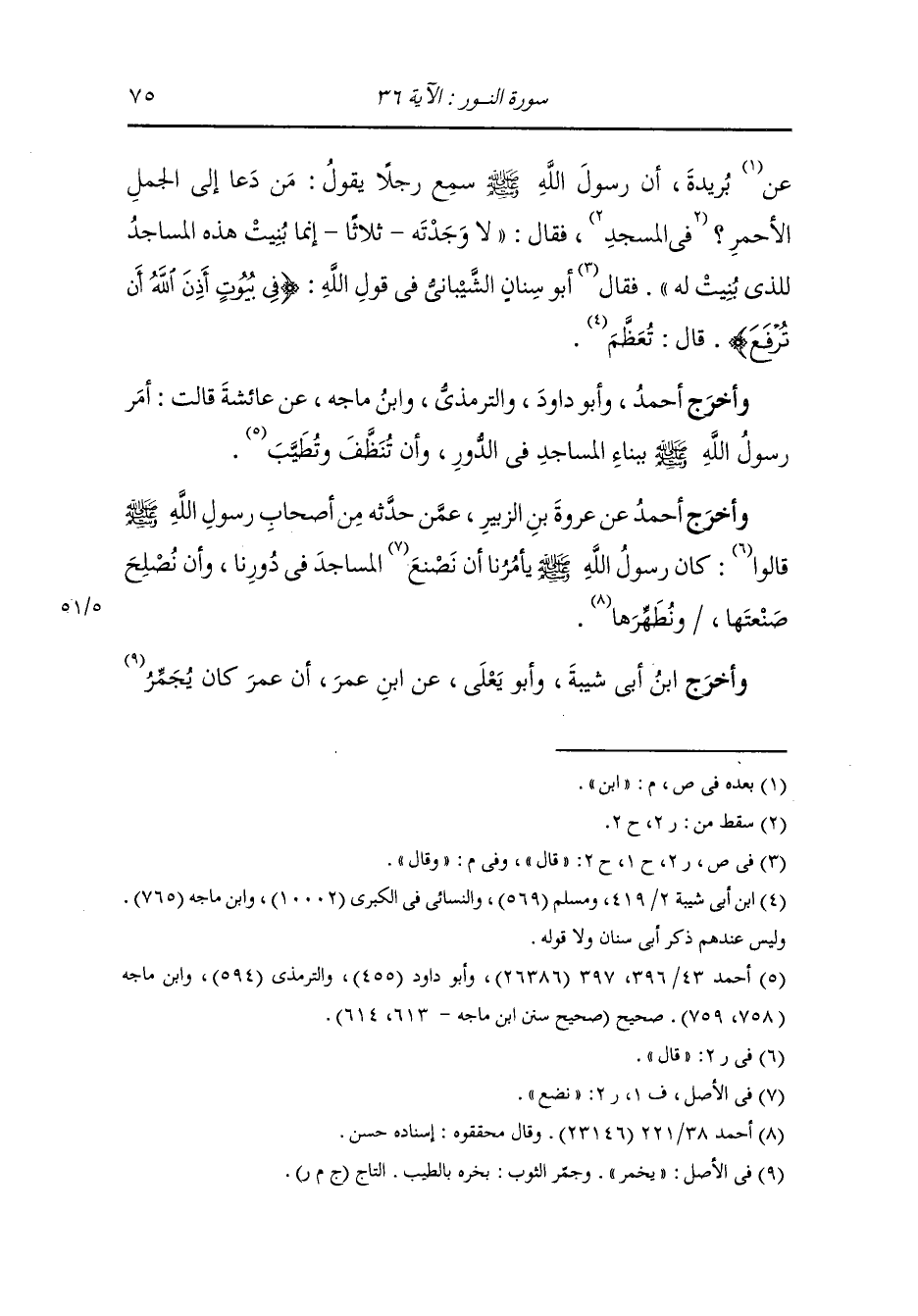 عن ابن بريدة ان رسول الله صلى الله عليه وسلم سمع رجلا يقول : من دعا إلى الجمل الأحمر في المسجد فقال : لا وجدته ثلاثا إنما بنيت هذه المساجد للذي بنيت له : وقال أبو سنان الشيباني في قوله {في بيوت أذن الله أن ترفع} قال : تعظم.