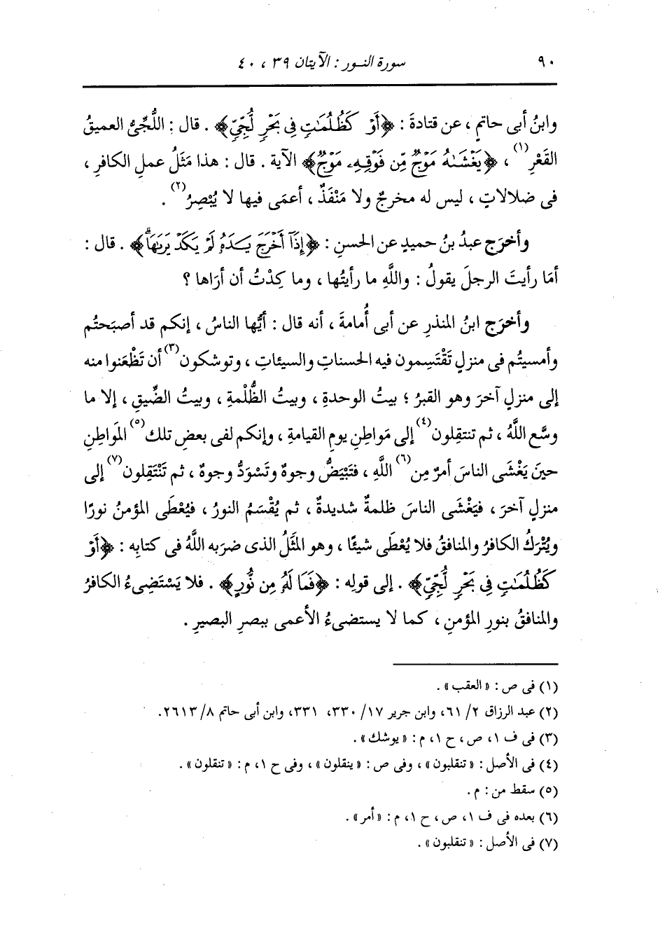 وابن أبي حاتم عن قتادة {أو كظلمات في بحر لجي} قال : اللجي : العميق القعر ، {يغشاه موج من فوقه موج} قال : هذا مثل عمل الكافر ف ضلاضلات ليس له مخرج ولا منفذ ، أعمى فيها لا يبصر.