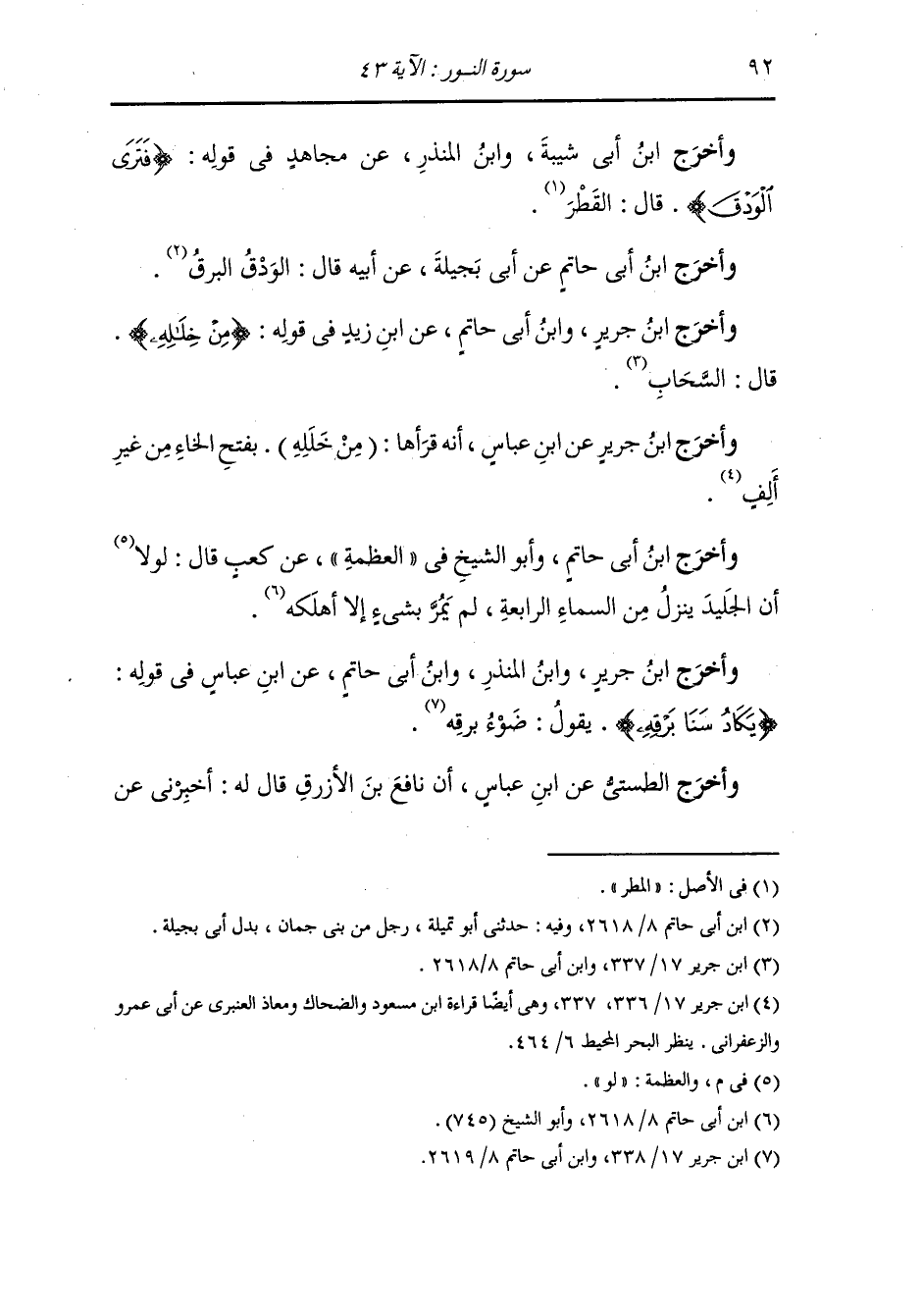 وأخرج ابن جرير ، وَابن المنذر ، وَابن أبي حاتم عن ابن عباس في قوله {يكاد سنا برقه} يقول : ضوء برقه.
