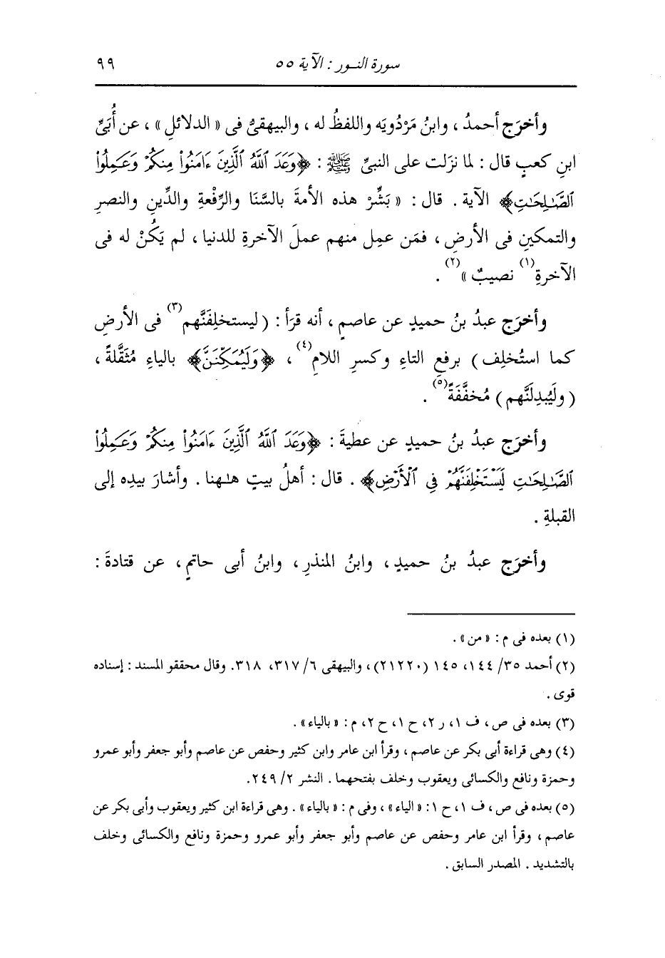 وأخرج عَبد بن حُمَيد عن عاصم أنه قرأ (ليستخلفهم) بالياء (في الأرض كما استخلف) برفع التاء وكسر اللام (وليمكنن) بالياء مثقلة (وليبدلنهم) مخففة بالياء.