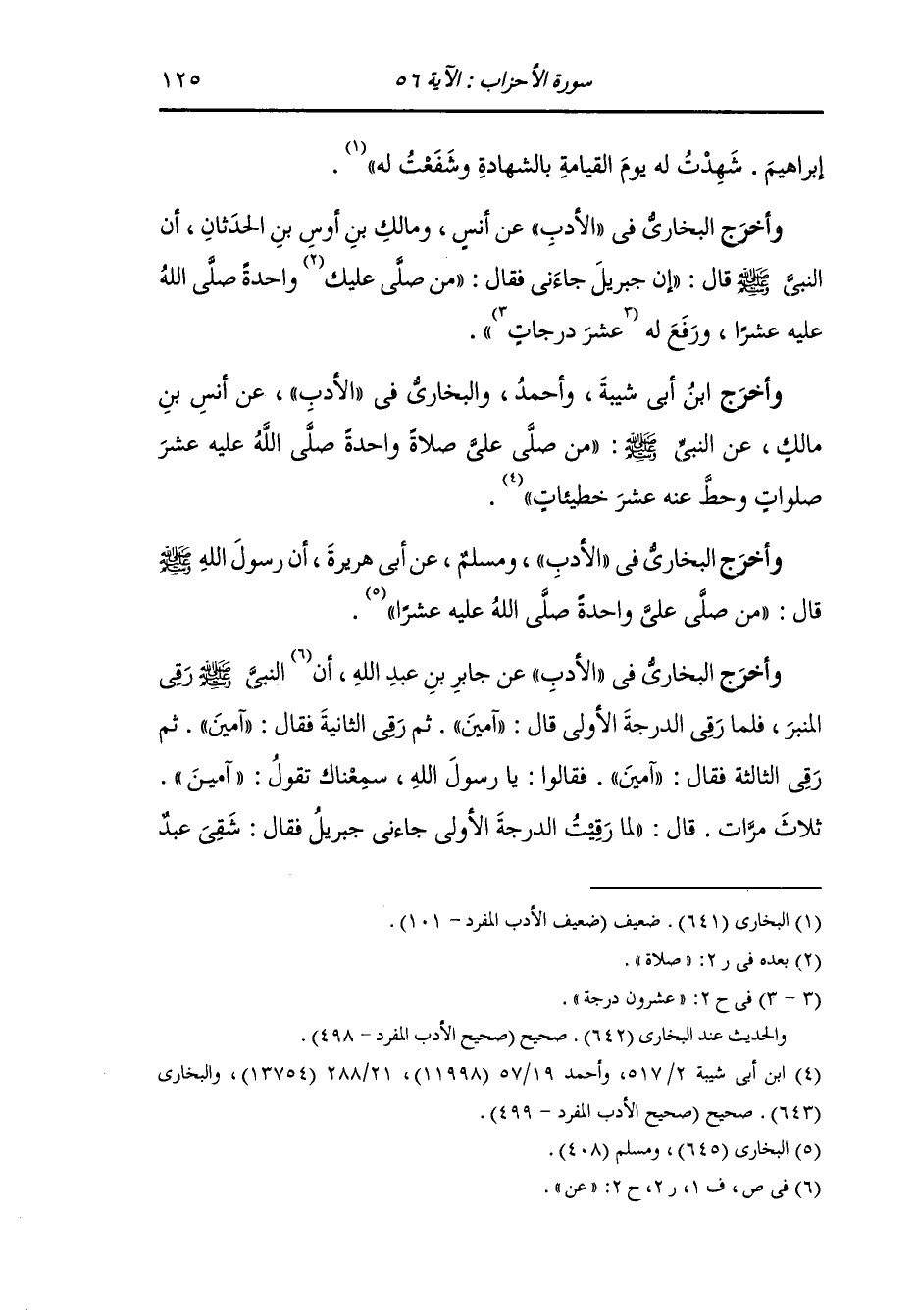 وأخرج البخاري في الادب المفرد عن أبي هريرة رضي الله عنه عن النَّبِيّ صلى الله عليه وسلم قال من قال : اللهم صل على محمد وعلى آل محمد كما صليت على إبراهيم وآل إبراهيم وبارك على محمد وعلى آل محمد كما باركت على إبراهيم وآل إبراهيم وترحم على محمد وعلى آل محمد كما ترحمت على إبراهيم وآل