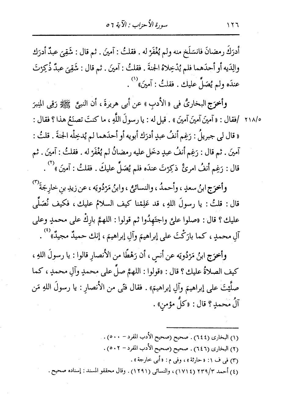 وأخرج البخاري في الأدب عن أنس ومالك بن أوس بن الحدثان ، ان النَّبِيّ صلى الله عليه وسلم قال ان جبريل عليه السلام جاءني فقال : من صلى عليك واحدة صلى الله عليه عشرا ورفع له عشر درجات.