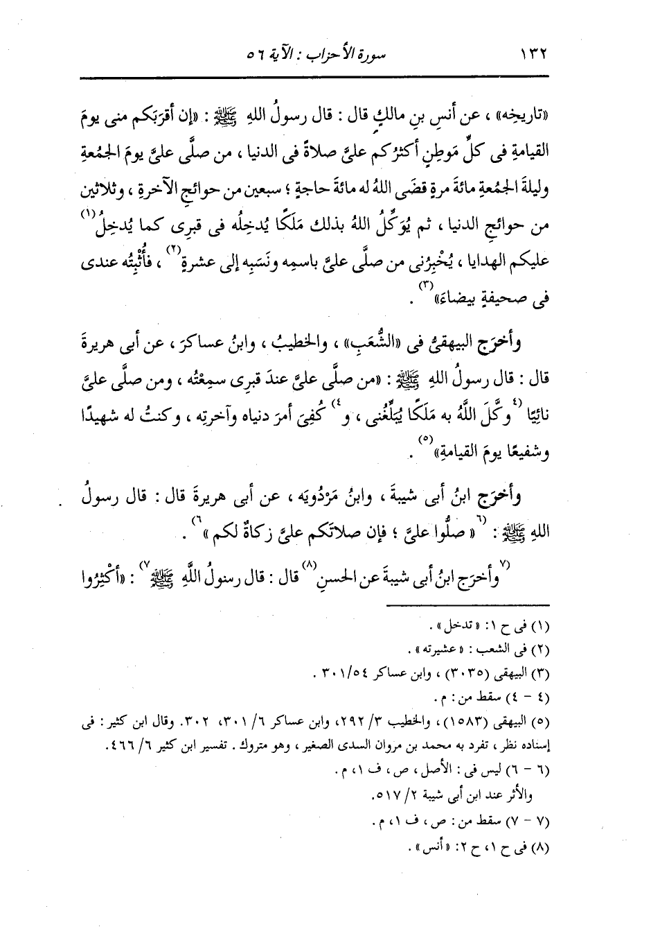 وأخرج ابن أبي شيبه وأحمد ، وعَبد بن حُمَيد والترمذي عن أبي طلحة الانصاري رضي الله عنه قال : أصبح رسول الله صلى الله عليه وسلم يوما طيب النفس يرى في وجهه البشر قالوا : يا رسول الله أصبحت اليوم طيبا يرى في وجهك البشر قال أتاني آت من ربي فقال : من صلى عليك من أمتك صلاة كتب الله له بها عشر حسنات ومحا عنه عشر سيآت ورفع له عشر درجات ورد عليه مثلها ، وفي لفظ فقال : أتاني الملك فقال : يا محمد أما يرضيك ان ربك يقول : انه لا يصلي عليك أحد من أمتك إلا صليت عليه عشرا ولا يسلم عليك أحد من أمتك إلا سلمت عليه عشرا قال : بلى.