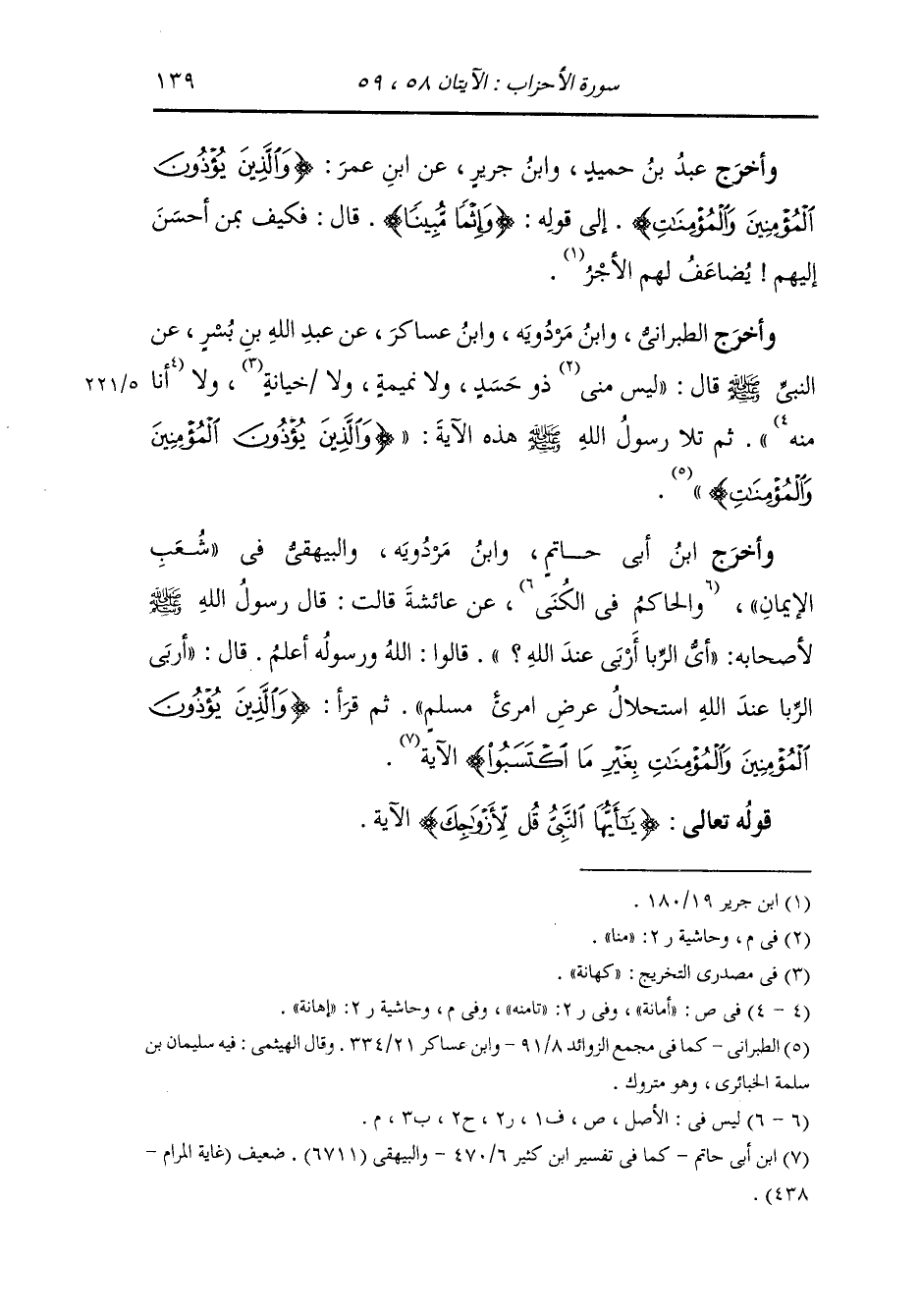 الآية قال : اياكم وأذى المؤمنين فان الله يحوطهم ويغضب لهم وقد زعموا أن عمر بن الخطاب قرأها ذات يوم فافزعه ذلك حتى ذهب إلى أبي بن كعب رضي الله عنه فدخل عليه فقال : يا أبا المنذر اني قرأت آية من كتاب الله تعالى فوقعت مني كل موقع {والذين يؤذون المؤمنين والمؤمنات} والله اني لأعاقبهم وأضربهم فقال له : انك لست منهم انما أنت معلم.
