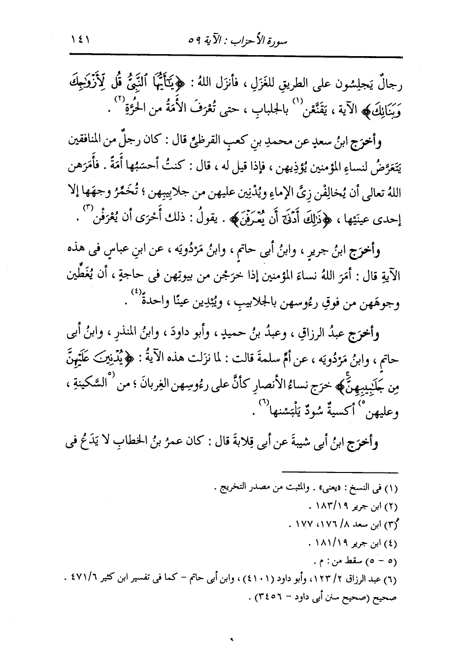وأخرج سعيد بن منصور ، وَابن سعد ، وعَبد بن حُمَيد ، وَابن المنذر ، وَابن أبي حاتم عن أبي مالك قال : كان نساء النَّبِيّ صلى الله عليه وسلم يخرجن بالليل لحاجتهن وكان ناس من المنافقين يتعرضون لهن فيؤذين فقيل : ذلك للمنافقين فقالوا : انما نفعله بالأماء ، فنزلت هذه الآية {يا أيها النَّبِيّ قل لأزواجك وبناتك ونساء المؤمنين يدنين عليهن من جلابيبهن ذلك أدنى أن يعرفن فلا يؤذين} فأمر بذلك حتى عرفوا من الأماء.