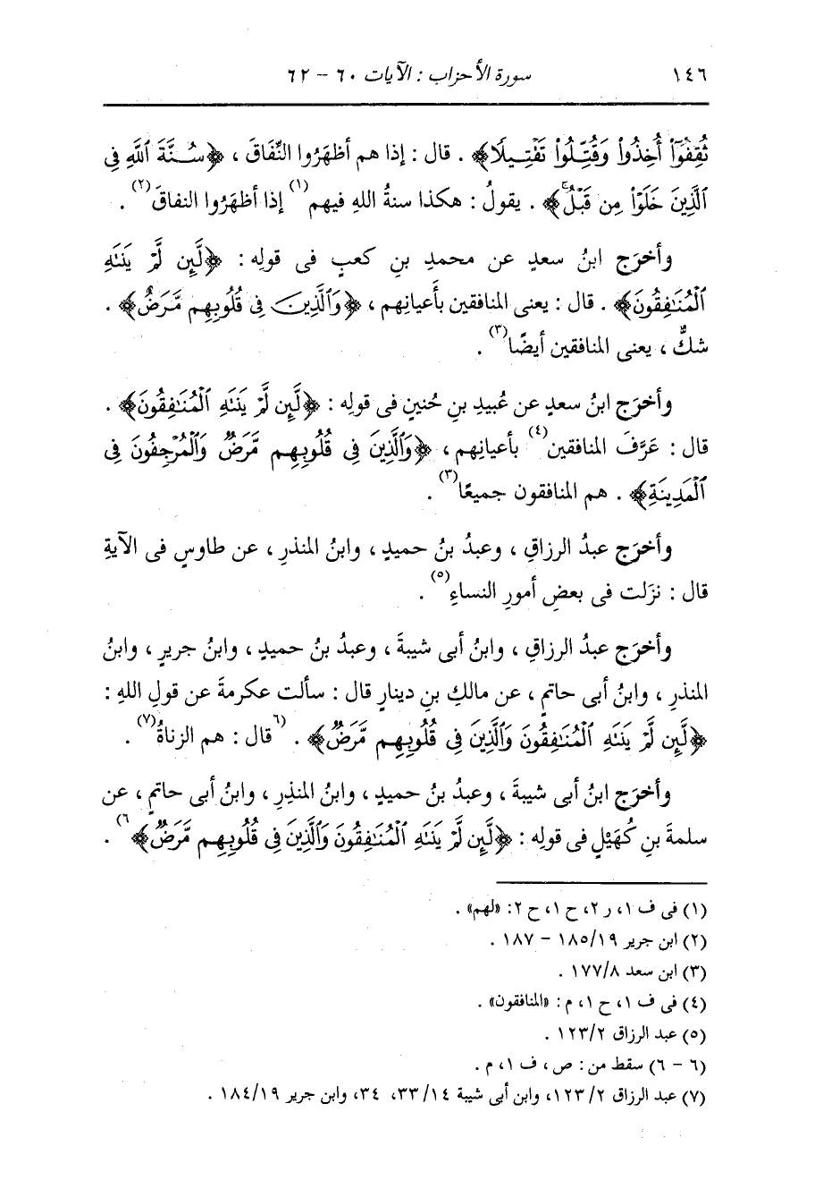 وأخرج عَبد بن حُمَيد ، وَابن جَرِير ، وَابن المنذر ، وَابن أبي حاتم عن قتادة رضي الله عنه في الآية قال (الارجاف) الكذب الذي كان يذيعه أهل النفاق ويقولون : قد أتاكم عدد وعدة ، وذكر لنا : ان المنافقين أرادوا ان يظهروا ما في قلوبهم من النفاق فأوعدهم الله بهذه الآية {لئن لم ينته المنافقون والذين في قلوبهم مرض} إلى قوله {لنغرينك بهم} أي لنحملك عليهم ولنحرشنك بهم فلما أوعدهم الله بهذه الآية كتموا ذلك وأسروه {ثم لا يجاورونك فيها إلا قليلا} أي بالمدينة {ملعونين} قال : على كل حال {أينما
