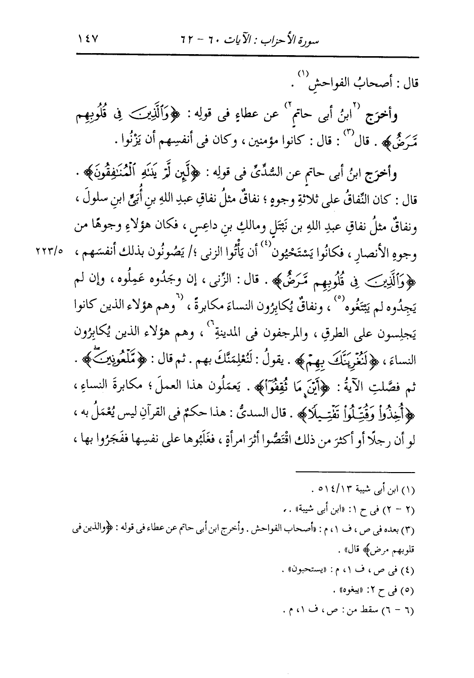وأخرج عبد الرزاق ، وَابن أبي شيبه ، وعَبد بن حُمَيد ، وَابن جَرِير ، وَابن المنذر ، وَابن أبي حاتم عن مالك بن دينار رضي الله عنه قال : سألت عكرمة رضي الله عنه عن قول الله {لئن لم ينته المنافقون والذين في قلوبهم مرض}