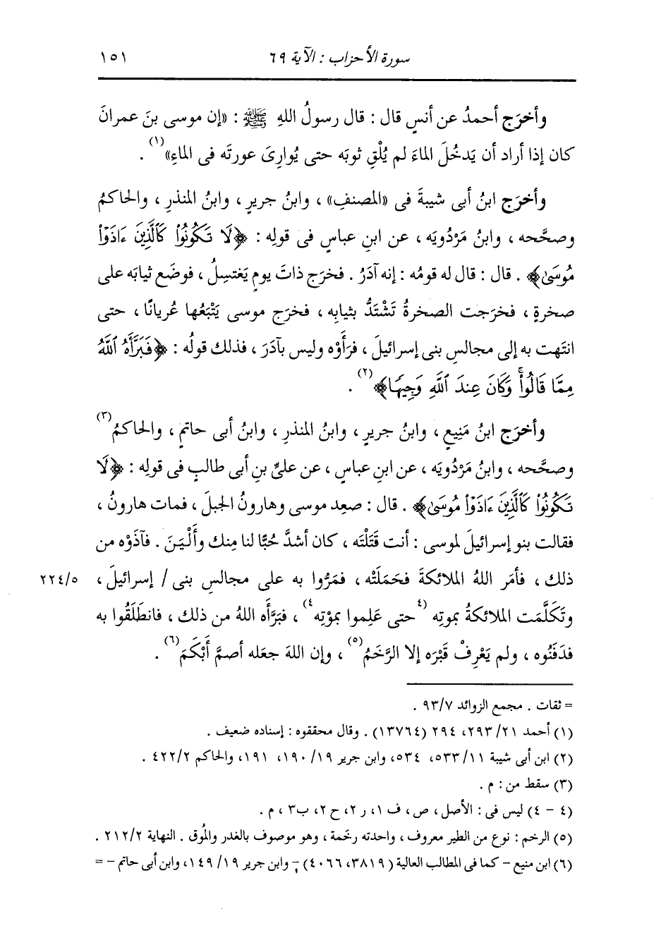أقبل إلى ثيابه ليأخذها وان الحجر عدا بثوبه فأخذ موسى عليه السلام عصاه وطلب الحجر فجعل يقول : ثوبي حجر ثوبي حجر حتى انتهى إلى ملأ من بني اسرائيل فرأوه عريانا أحسن ما خلق الله وأبرأه مما يقولون وقام الحجر فأخذ ثوبه فلبسه وطفق بالحجر ضربا بعصاه فوالله ان بالحجر لندبا من أثر ضربه ، ثلاثا ، أو أربعا أو خمسا ، فذلك قوله {يا أيها الذين آمنوا لا تكونوا كالذين آذوا موسى فبرأه الله مما قالوا}.