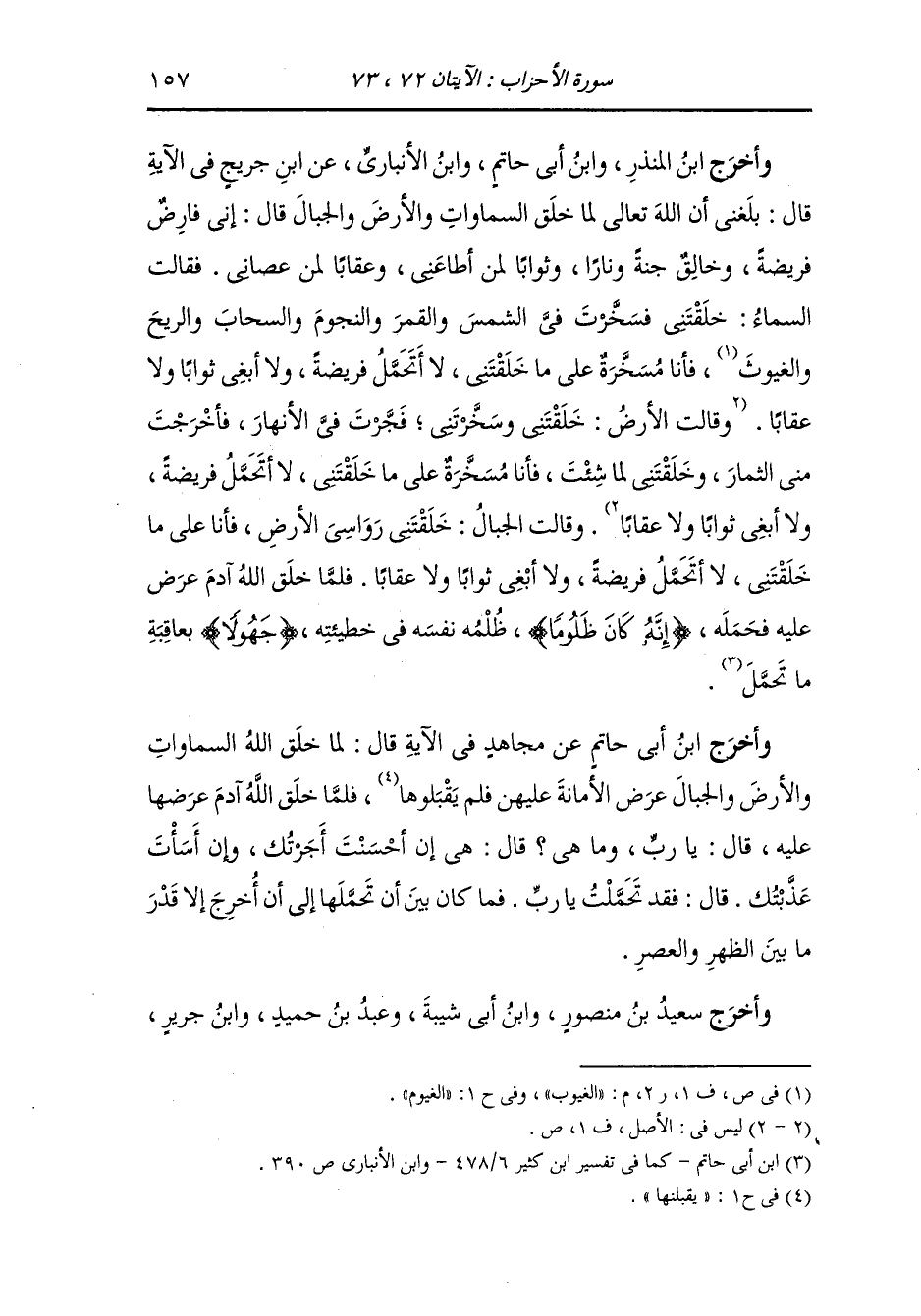 أخرج ابن جرير ، وَابن المنذر ، وَابن أبي حاتم ، وَابن الانباري في كتاب الأضداد عن ابن عباس رضي الله عنهما في قوله {إنا عرضنا الأمانة} الآية ، قال : الامانة الفرائض عرضها الله على السموات والأرض والجبال ان أدوها أثابهم وان ضيعوها عذبهم فكرهوا ذلك واشفقوا من غير معصية ولكن تعظيما لدين الله ان لا يقوموا بها ثم عرضها على آدم فقبلها بما فيها ، وهو قوله {وحملها الإنسان إنه كان ظلوما جهولا} يعني غرا بأمر الله.