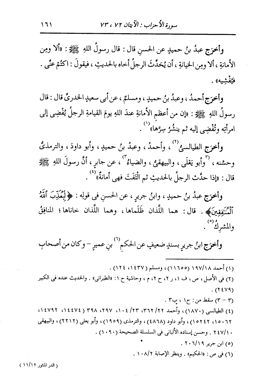وأخرج الفريابي ، وعَبد بن حُمَيد ، وَابن المنذر ، وَابن أبي حاتم والحاكم والبيهقي في "سُنَنِه" عن أبي بن كعب رضي الله عنه قال : من الأمانة ان ائتمنت المرأة على فرجها.