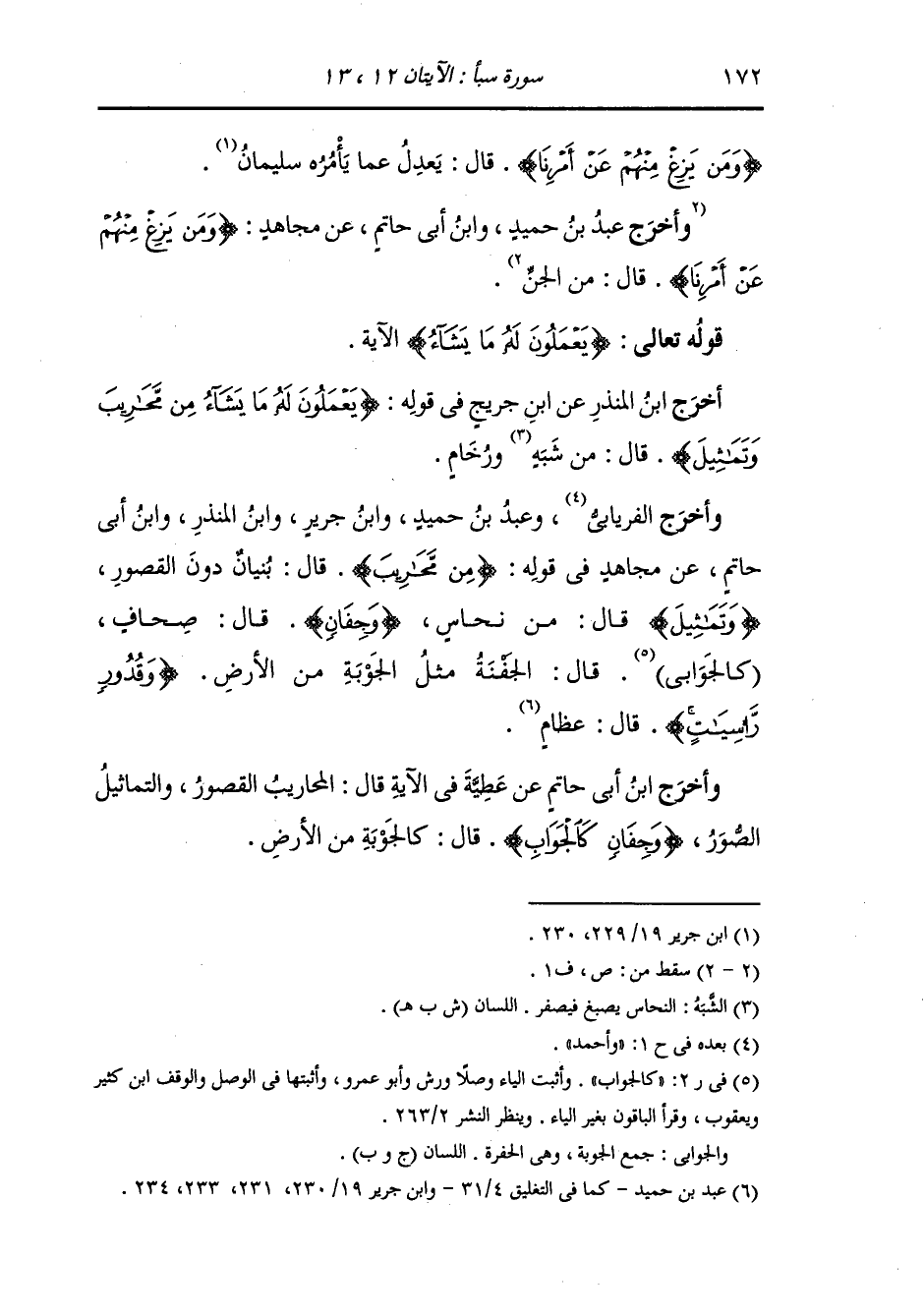 وأخرج عَبد بن حُمَيد ، وَابن جَرِير ، وَابن أبي حاتم عن قتادة رضي الله عنه قال : ليس كل الجن صخر له كما تسمعون {ومن الجن من يعمل بين يديه بإذن ربه