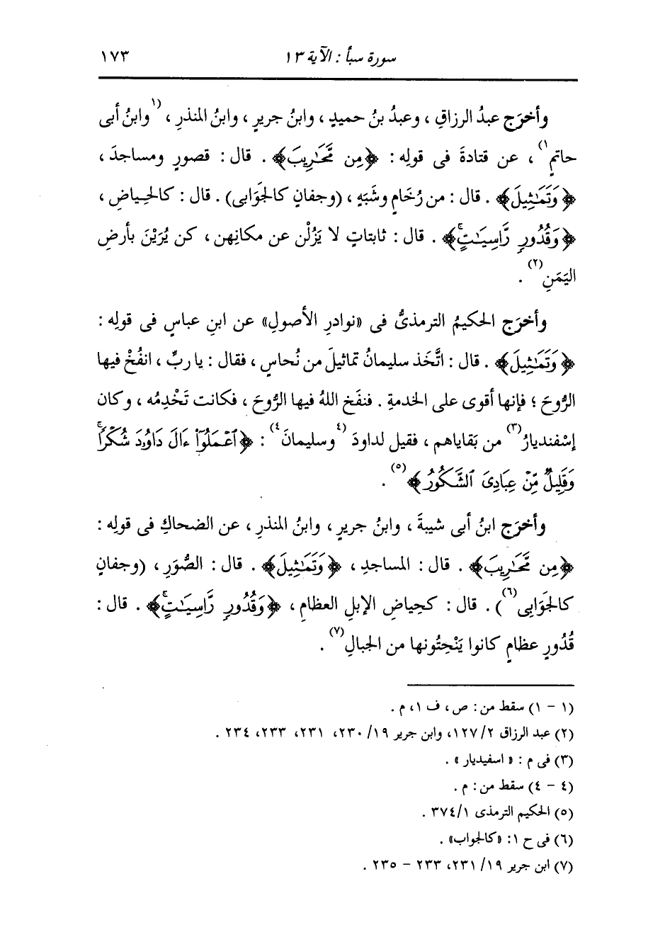 وأخرج الفريابي ، وعَبد بن حُمَيد ، وَابن جَرِير ، وَابن المنذر ، وَابن أبي حاتم عن مجاهد رضي الله عنه في قوله {من محاريب} قال : بنيان دون القصور {وتماثيل} قال : من نحاس {وجفان} قال : صحاف كالجوابي قال : الجفنة مثل الجوبة من الأرض {وقدور راسيات} قال : عظام.