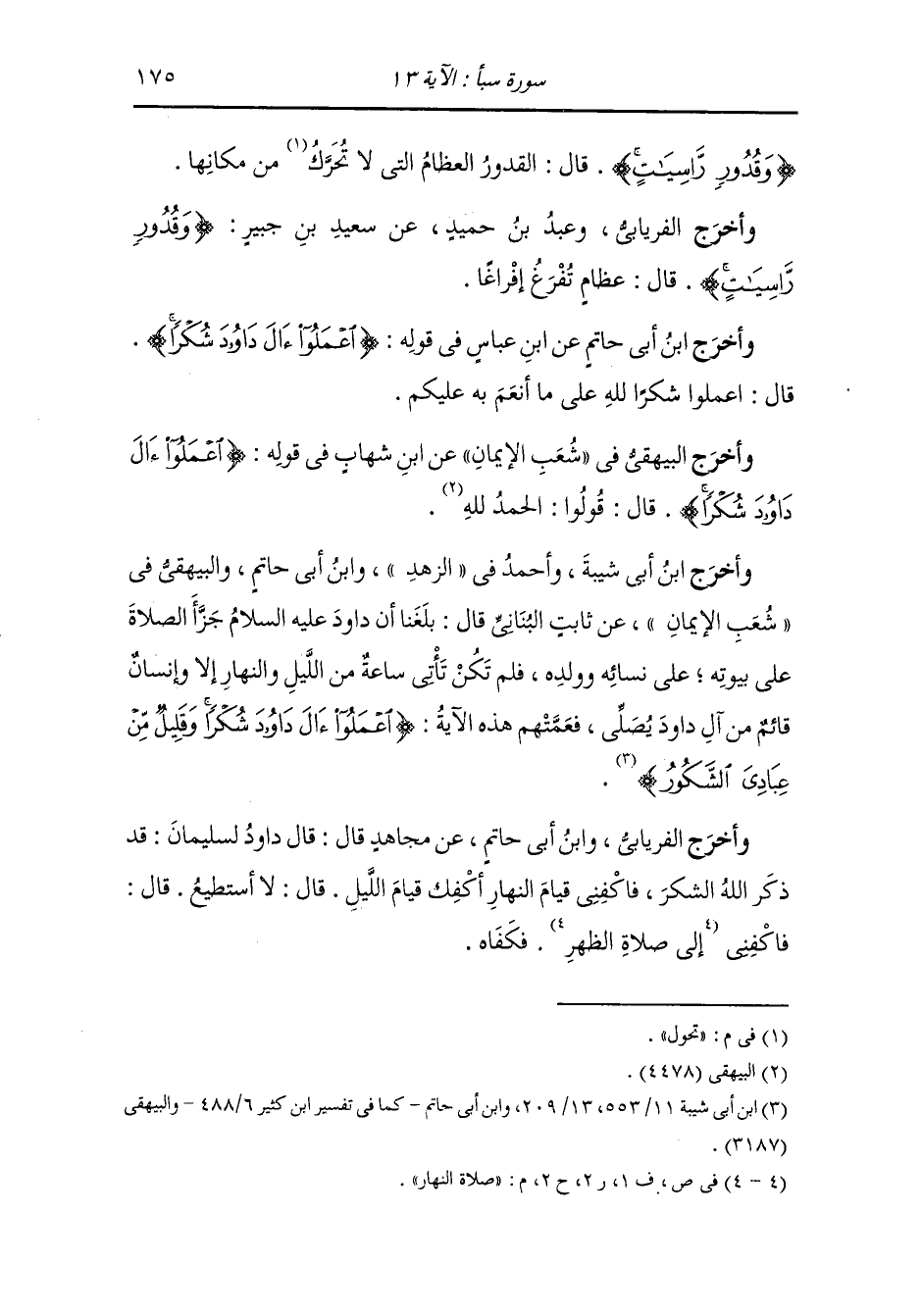 وأخرج ابن جرير ، وَابن أبي حاتم عن ابن عباس رضي الله عنهما في قوله {وجفان كالجواب} قال : كالجوبة من الأرض {وقدور راسيات} قال : أثافيها منها.
