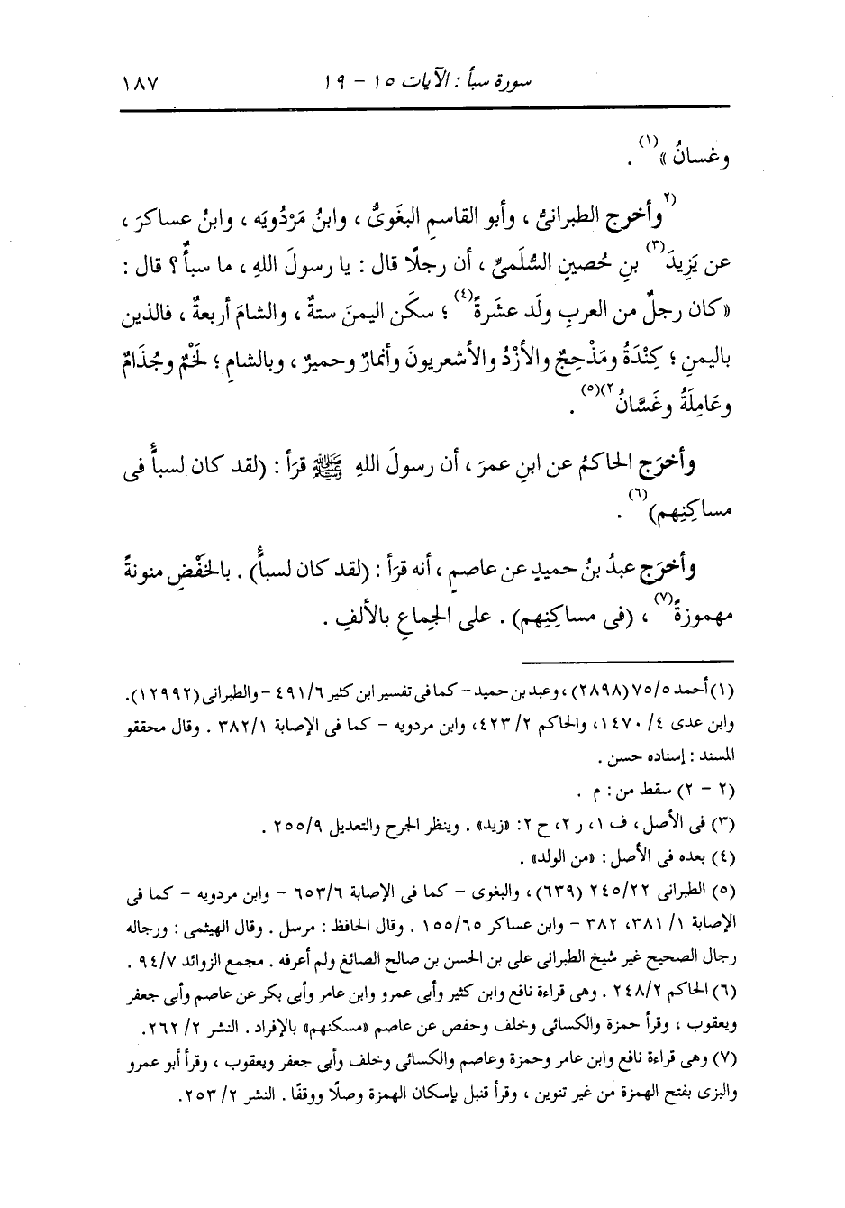 وأخرج أحمد ، وعَبد بن حُمَيد والطبراني ، وَابن أبي حاتم ، وَابن عدي والحاكم وصححه ، وَابن مردويه عن ابن عباس رضي الله عنهما أن رجلا سأل النَّبِيّ صلى الله عليه وسلم عن سبأ أرجل هو أو امرأة أم أرض فقال : بل هو رجل ولد عشرة فسكن اليمن منهم ستة وبالشام منهم أربعة فأما اليمانيون فمذحج وكندة والأزد والأشعريون وأنمار وحمير.