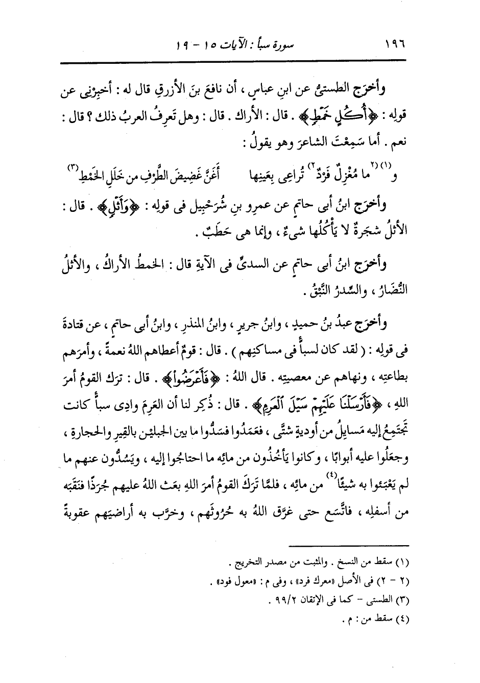 وأخرج الفريابي ، وعَبد بن حُمَيد ، وَابن جَرِير ، وَابن المنذر ، وَابن أبي حاتم عن مجاهد رضي الله عنه في قوله {سيل العرم} السد ماء أحمر أرسله الله في السد فشقه وهمه وحفر الوادي عن الجنتين فارتفعا وغار عنهما الماء فيبستا ولم يكن الماء الاحمر من السد كان شيئا أرسله الله عليهم ، وفي قوله {أكل خمط} قال : الخمط الاراك.