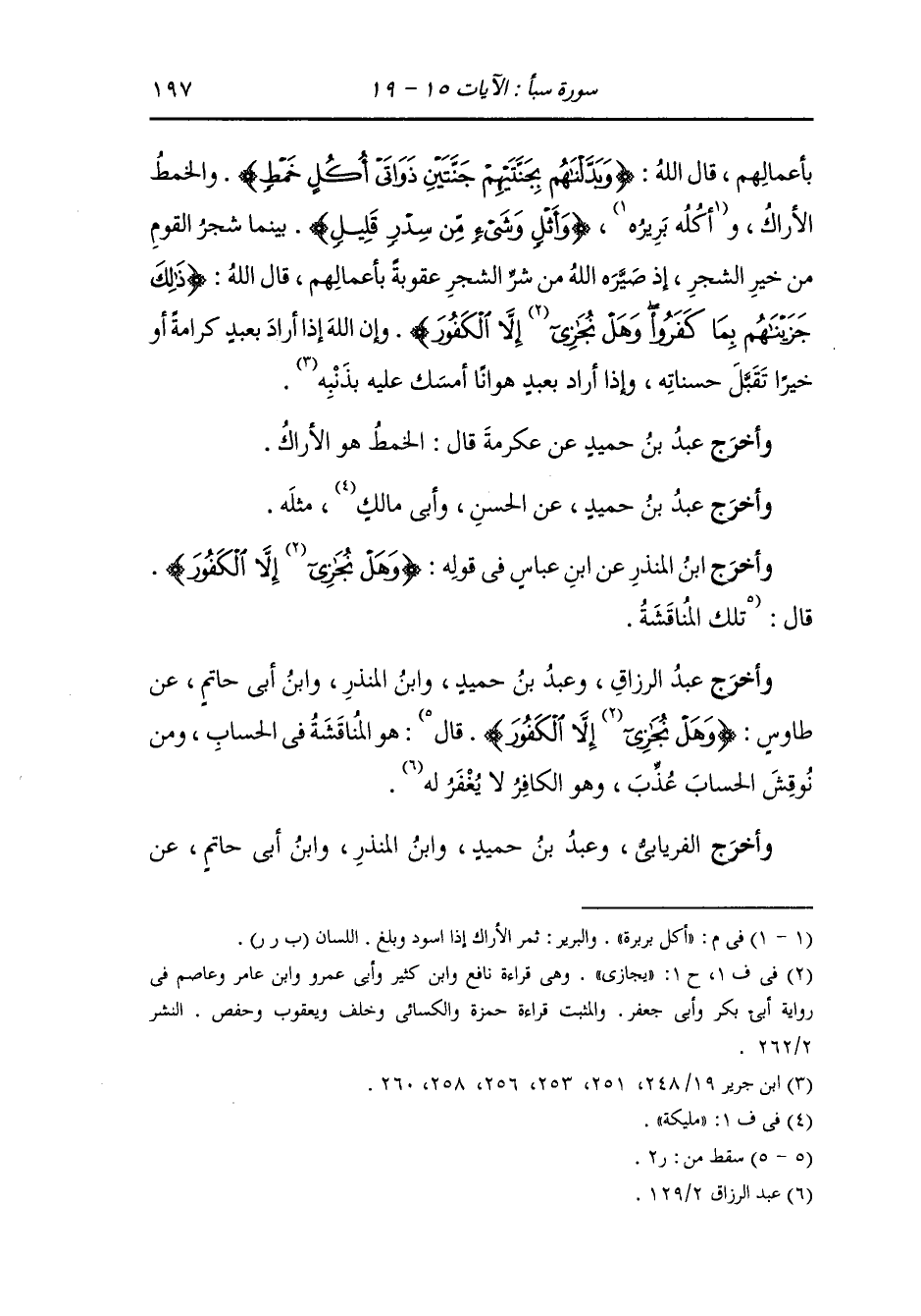 وأخرج عَبد بن حُمَيد ، وَابن جَرِير ، وَابن المنذر ، وَابن أبي حاتم عن قتادة في قوله {لقد كان لسبإ في مسكنهم} ، قال : قوم أعطاهم الله نعمة وأمرهم بطاعته ونهاهم عن معصيته قال الله {فأعرضوا} قال : ترك القوم أمر الله {فأرسلنا عليهم سيل العرم} ذكر لنا {العرم} وادي سبأ كانت تجتمع اليه مسايل من أودية شتى فعمدوا فسدوا ما بين الجبلين بالقير والحجارة وجعلوا عليه أبوابا وكانوا يأخذون من مائة ما احتاجوا اليه ويسدون عنهم ما لم يعبؤا به من مائة فلما تركوا أمر الله بعث الله عليهم جرذا فنقبه من أسفله فاتسع حتى غرق الله به حروثهم وخرب به أراضيهم عقوبة بأعمالهم قال الله {وبدلناهم بجنتيهم جنتين ذواتي أكل خمط}