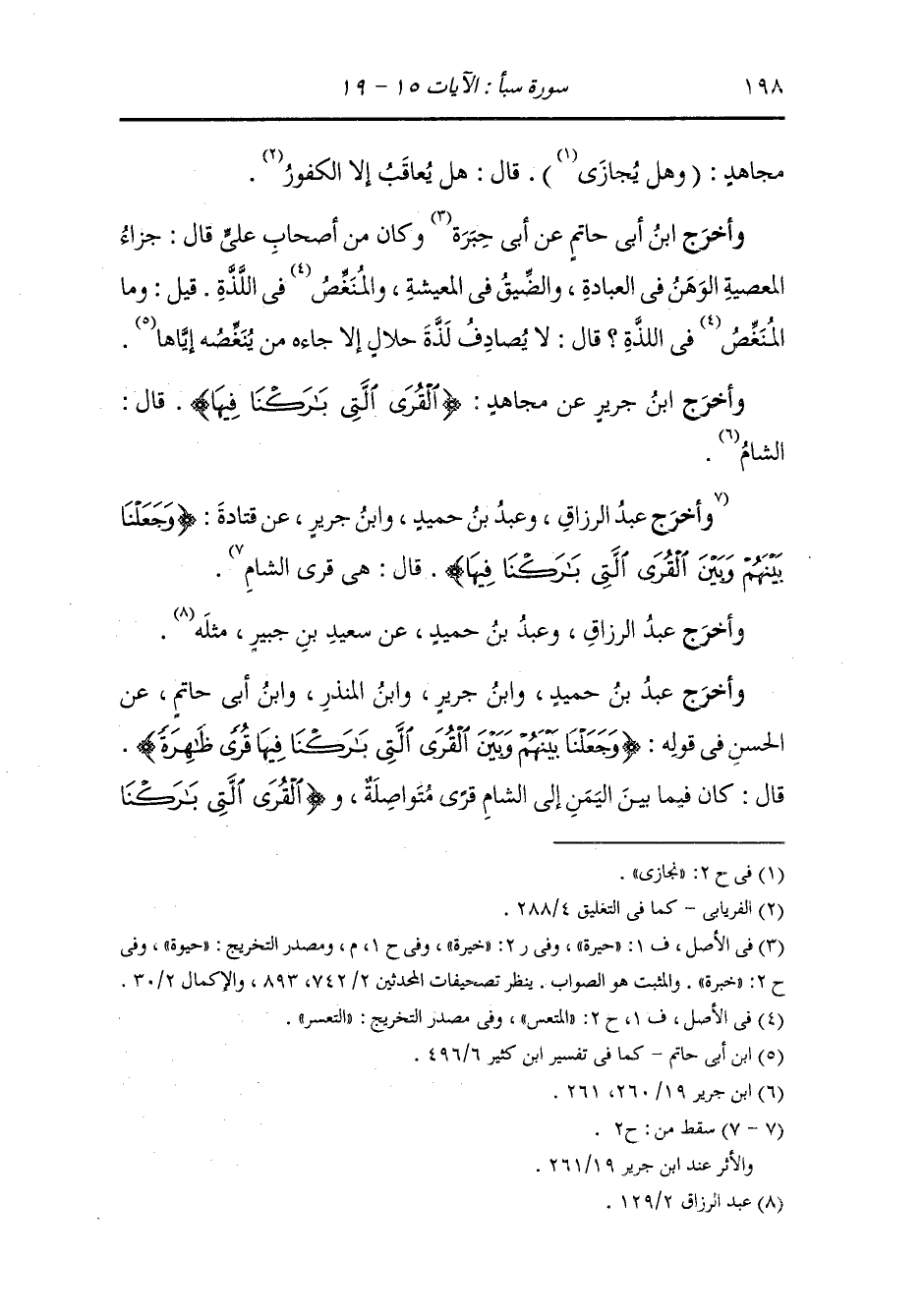 وأخرج عبد الرزاق ، وعَبد بن حُمَيد ، وَابن المنذر ، وَابن أبي حاتم ، عَن طاووس {وهل نجازي إلا الكفور} قال : هو المناقشة في الحساب ومن نوقش الحساب عذب وهو الكافر لا يغفر له.