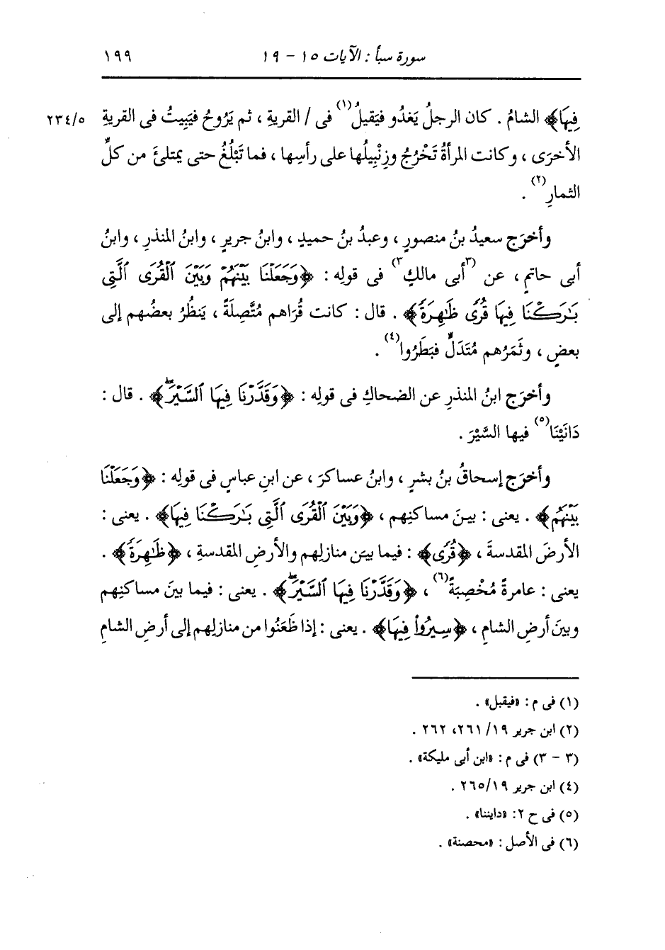 وأخرج عَبد بن حُمَيد ، وَابن جَرِير ، وَابن المنذر ، وَابن أبي حاتم عن الحسن في قوله {وجعلنا بينهم وبين القرى التي باركنا فيها قرى ظاهرة} قال : كان فيما بين اليمن إلى الشام قرى متواصلة و{القرى التي باركنا