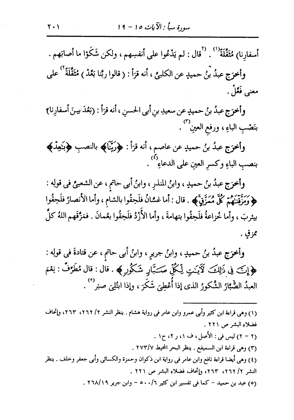 وأخرج عبد الرزاق ، وعَبد بن حُمَيد ، وَابن جَرِير ، وَابن المنذر ، وَابن أبي حاتم عن قتادة رضي الله عنه في قوله {سيروا فيها ليالي وأياما آمنين} قال : لا يخافون جوعا ولا ظمأ انما يغدون فيقيلون في قرية ويروحون فيبيتون في قرية أهل جنة ونهر حتى ذكر لنا : أن المرأة كانت تضع مكتلها على رأسها فيمتلى ء قبل أن ترجع إلى أهلها وكان الرجل يسافر لا يحمل معه زادا فبطروا النعمة {فقالوا ربنا باعد بين أسفارنا} فمزقوا {كل ممزق} وجعلوا أحاديث.