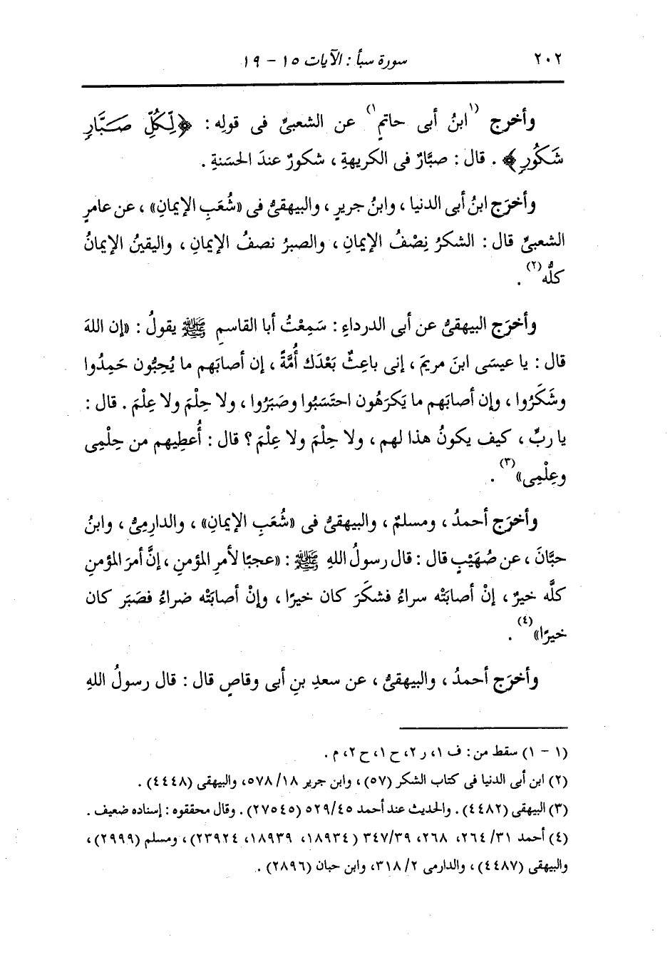 وأخرج عَبد بن حُمَيد ، وَابن جَرِير ، وَابن أبي حاتم عن قتادة رضي الله عنه في قوله {إن في ذلك لآيات لكل صبار شكور} قال : مطرف في قوله {إن في ذلك لآيات} نعم العبد الصبار الشكور الذي إذا أعطي شكر واذا ابتلي صبر .
