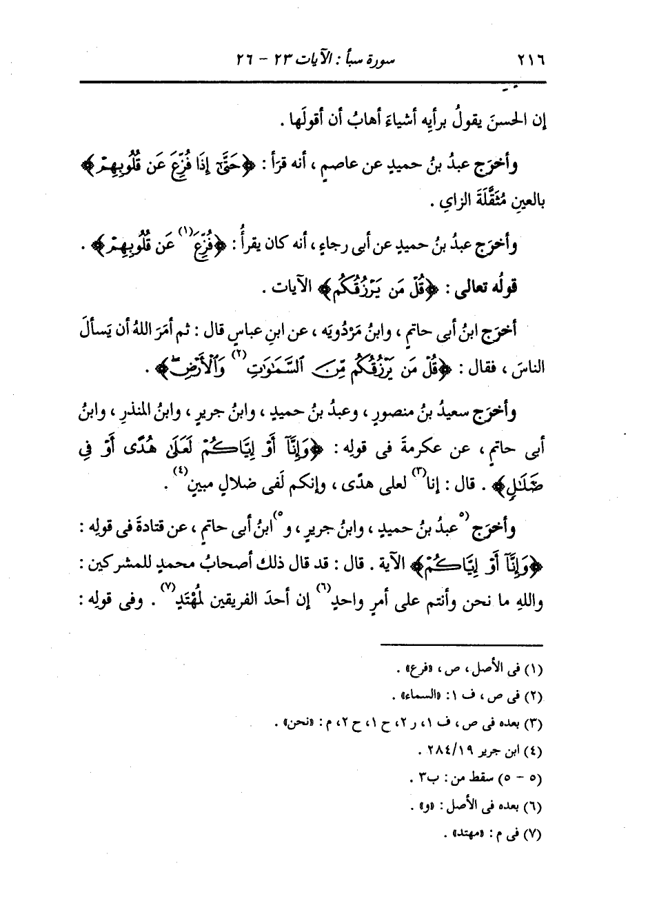 وأخرج عَبد بن حُمَيد عن محمد بن سيرين أنه سأل كيف تقرأ هذه الآية {حتى إذا فزع عن قلوبهم} أو {فزع عن قلوبهم} قال {إذا فزع عن قلوبهم} قال :