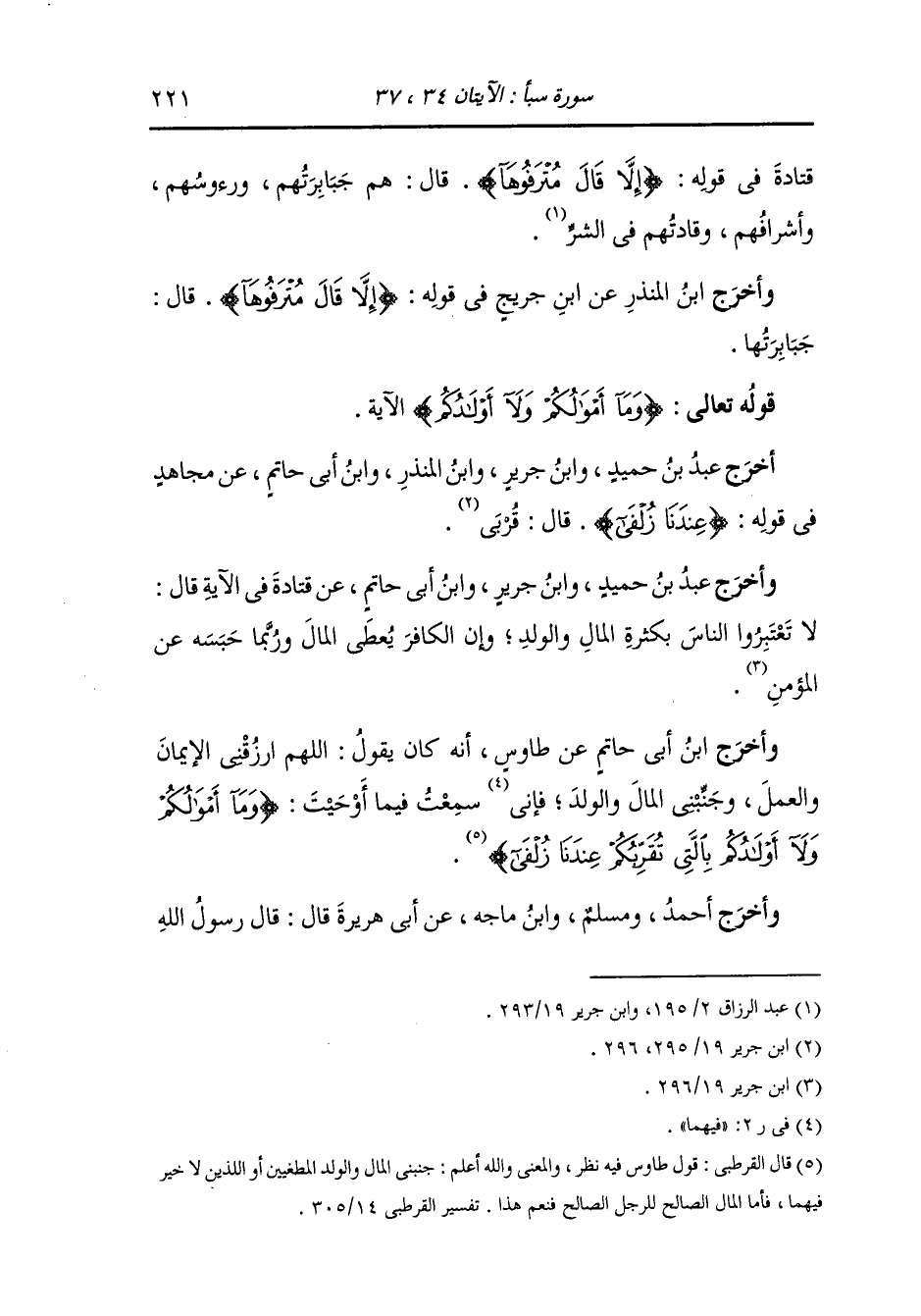 - قوله تعالى : وما أرسلنا في قرية من نذير إلا قال مترفوها إنا بما أرسلتم به كافرون * وقالوا نحن أكثر أموالا وأولادا وما نحن بمعذبين * قل إن ربي يبسط الرزق لمن يشاء ويقدر ولكن أكثر الناس لا يعلمون.