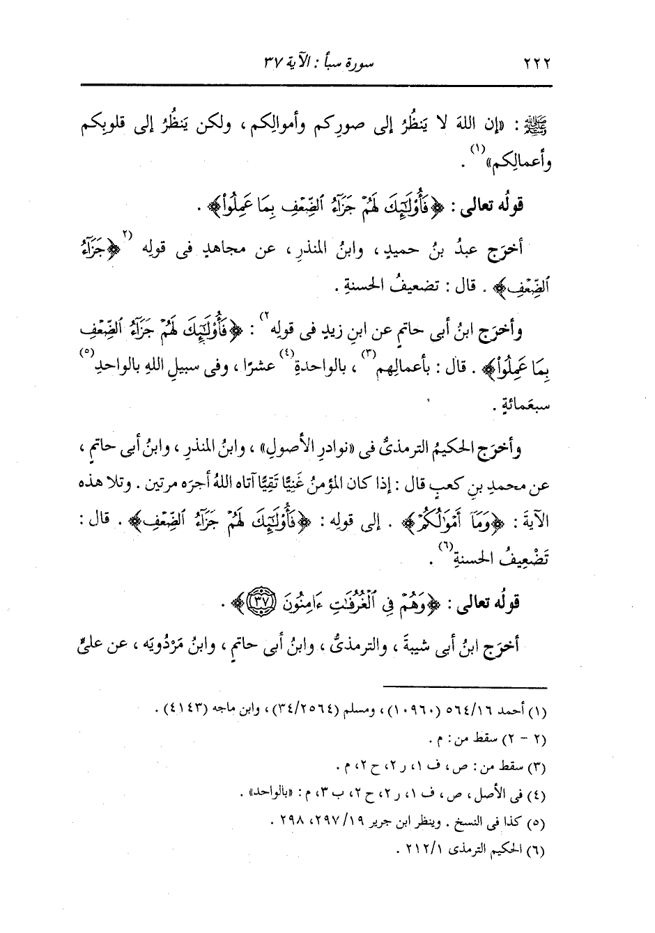 - قوله تعالى : وما أموالكم ولا أولادكم بالتي تقربكم عندنا زلفى إلا من آمن وعمل صالحا فأولئك لهم جزاء الضعف بما عملوا وهم في الغرفات آمنون * والذين يسعون في آياتنا معاجزين أولئك في العذاب محضرون.