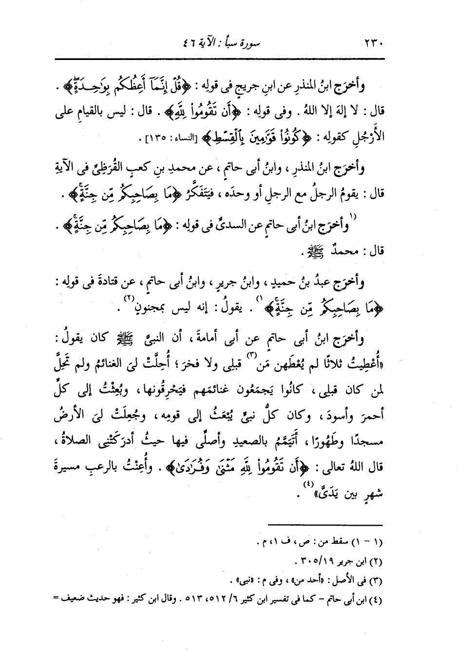 وأخرج عبد الرزاق ، وعَبد بن حُمَيد ، وَابن جَرِير ، وَابن أبي حاتم عن قتاده رضي الله عنه في قوله {وكذب الذين من قبلهم} قال : كذب الذين قبل هؤلاء {وما بلغوا معشار ما آتيناهم} قال : يخبركم أنه أعطى القوم ما لم يعطكم من القوة وغير ذلك {فكيف كان نكير} يقول : فقد أهلك الله أولئك وهم أقوى وأخلد ، قوله تعالى : قل إنما أعظكم بواحدة أن تقوموا لله مثنى وفرادى ثم تتفكروا ما بصاحبكم من جنة إن هو إلا نذير لكم بين يدي عذاب شديد.