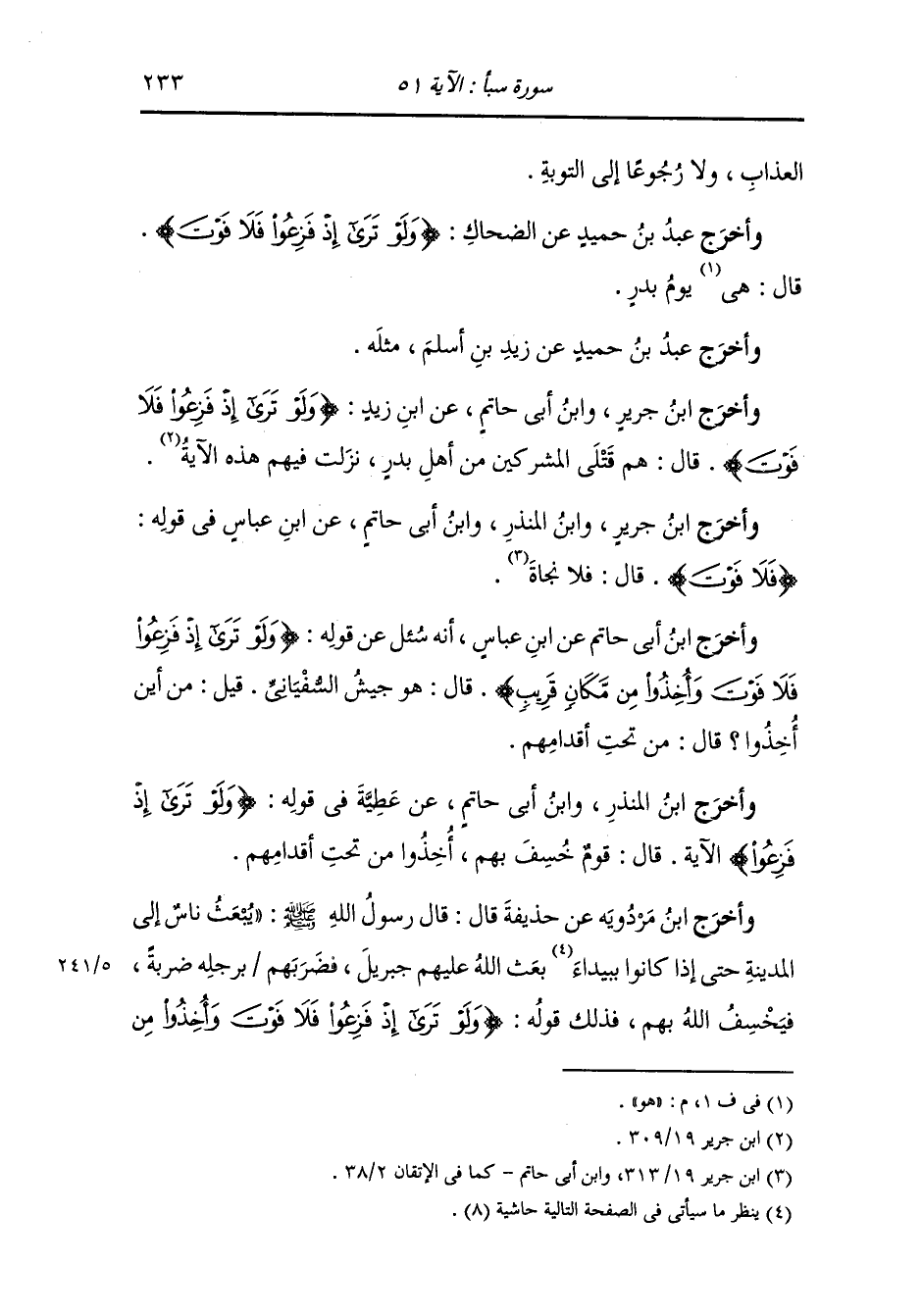 - قوله تعالى : ولو ترى إذ فزعوا فلا فوت وأخذوا من مكان قريب.
