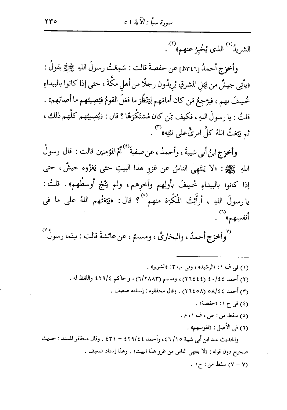 وَأخرَج أحمد ومسلم والحاكم عن حفصه أم المؤمنين رضي الله عنها سمعت رسول الله صلى الله عليه وسلم يقول : ليؤمن هذا البيت جيش يغزونه حتى إذا كانوا بالبيداء خسف أوساطهم فينادي أولهم آخرهم فيخسف بهم خسفا فلا ينجو إلا
