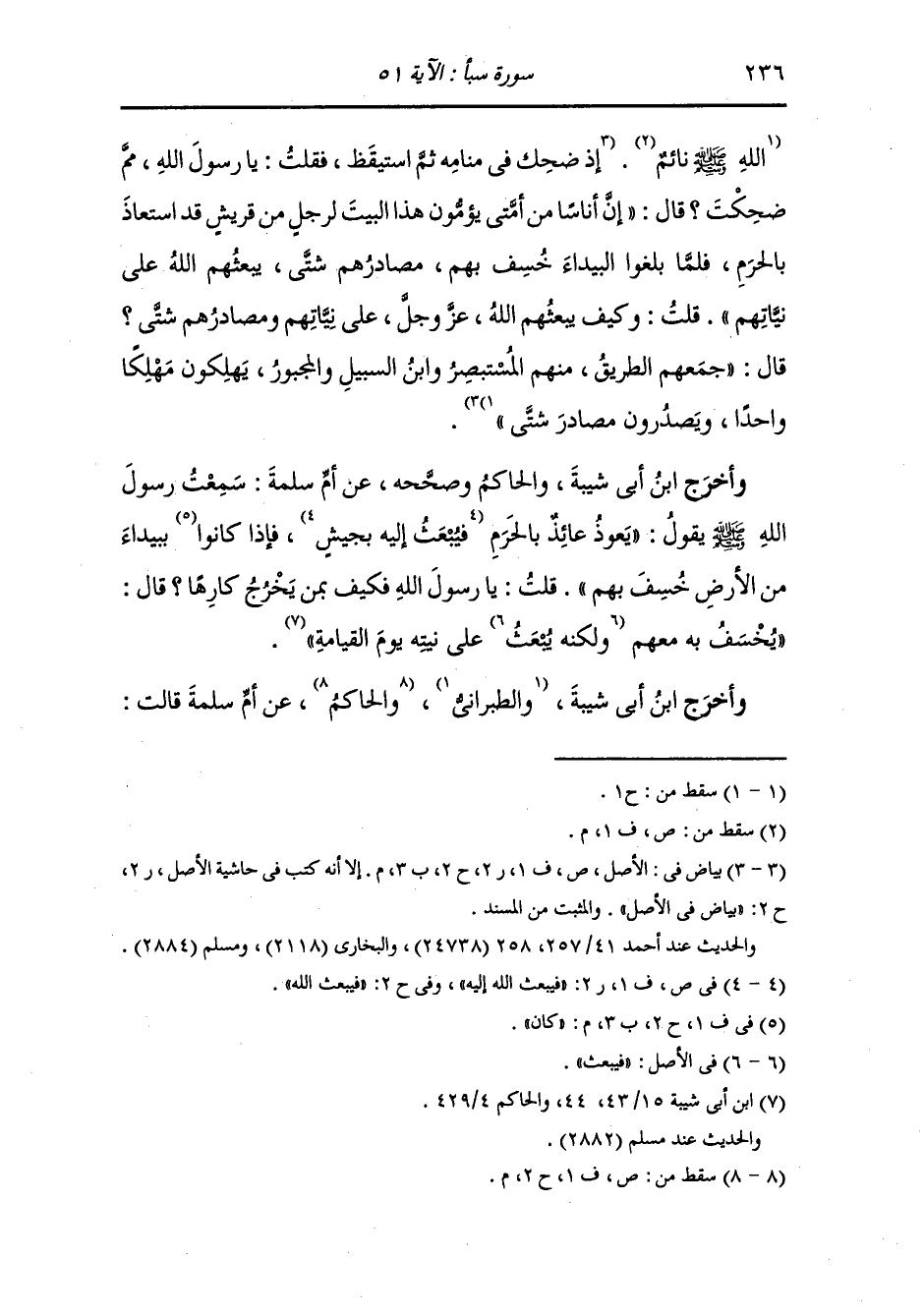 وَأخرَج ابن أبي شيبه وأحمد عن صفيه أم المؤمنين رضي الله عنها قالت : قال رسول الله صلى الله عليه وسلم لا ينتهي الناس عن غزو هذا البيت حتى يغزوه جيش حتى إذا كانوا بالبيداء خسف بأولهم وآخرهم ولم ينج أوسطهم قلت : يا رسول الله أرأيت المكره قال : يبعثهم الله على ما في أنفسهم.