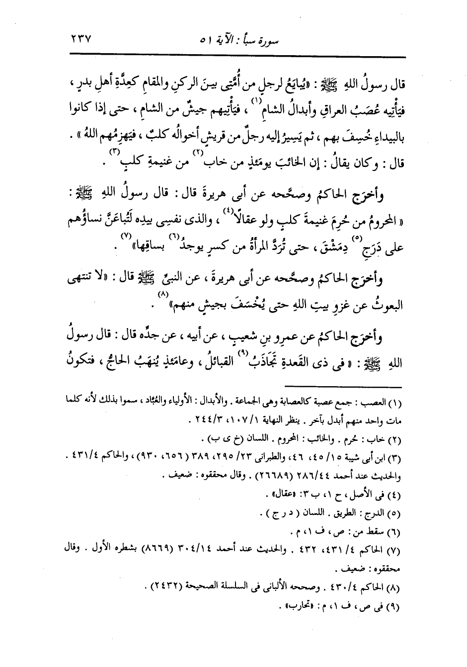 وَأخرَج ابن أبي شيبه والحاكم وصححه عن أم سلمه رضي الله عنها سمعت رسول الله صلى الله عليه وسلم يقول يعوذ عائذ بالحرم فيبعث إليه بعث فإذا كان ببيداء من الأرض خسف بهم قلت : يا رسول الله فكيف بمن يخرج كارها قال : يخسف به معهم ولكنه يبعث على نيته يوم القيامه.