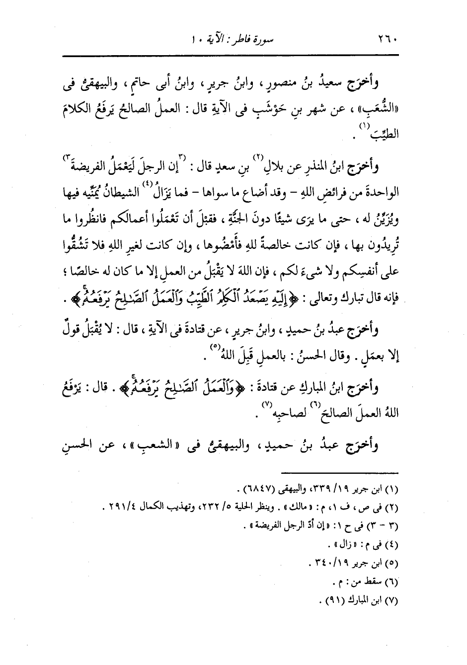 وأخرج ابن المبارك وسعيد بن منصور ، وعَبد بن حُمَيد ، وَابن المنذر ، وَابن أبي حاتم عن الضحاك في قوله {إليه يصعد الكلم الطيب والعمل الصالح يرفعه} قال : العمل الصالح يرفع الكلام الطيب.