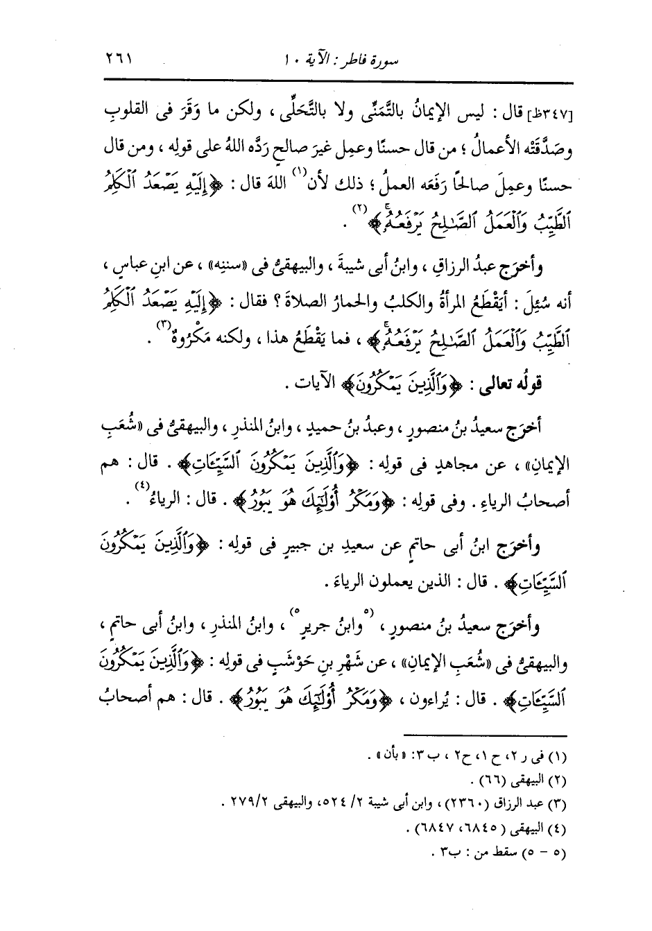 وأخرج سعيد بن منصور ، وَابن جَرِير ، وَابن أبي حاتم والبيهقي في الشعب عن شهر بن حوشب في الآية قال : العمل الصالح يرفع الكلام الطيب.