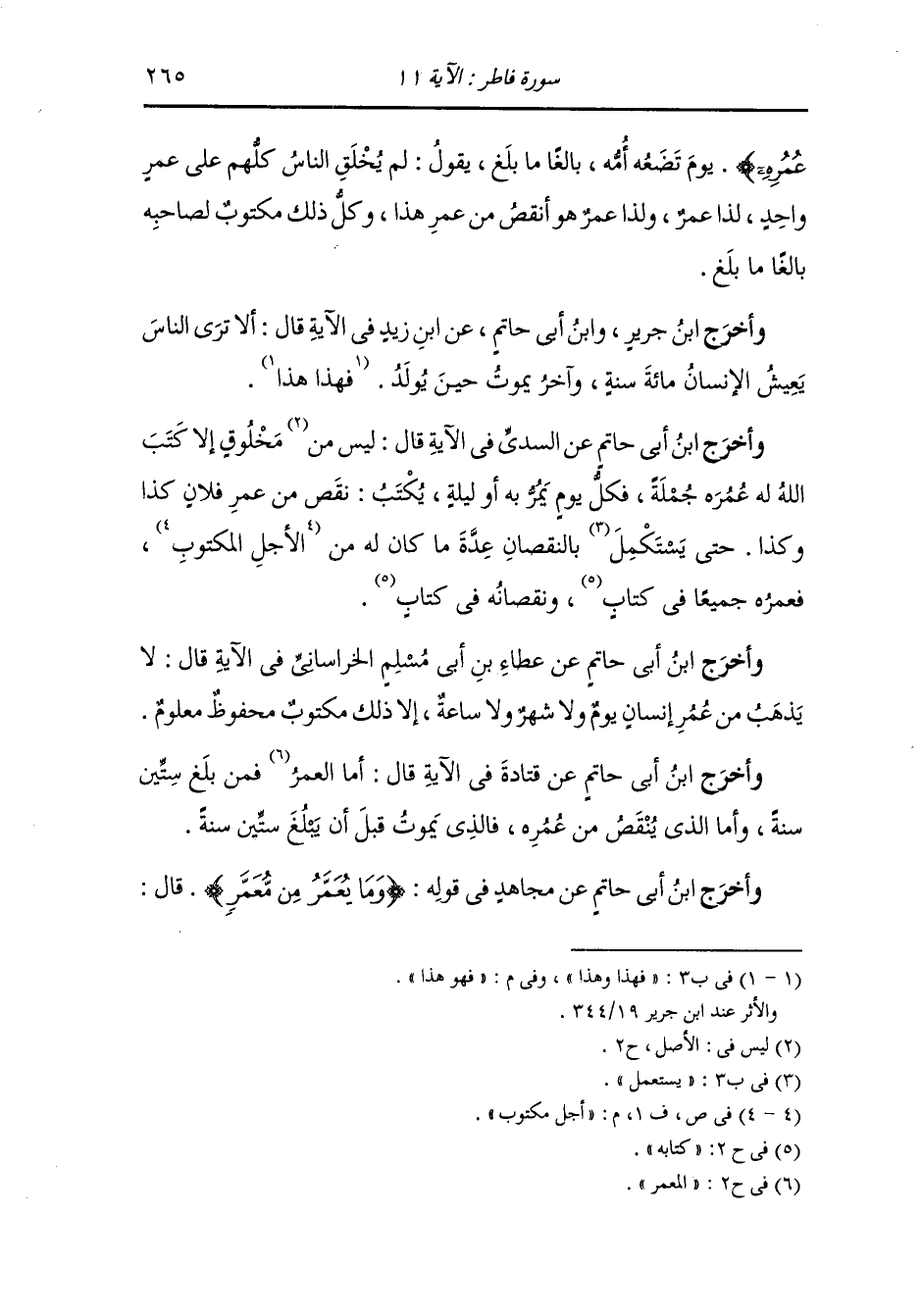 وأخرج عَبد بن حُمَيد ، وَابن المنذر ، وَابن أبي حاتم وأبو الشيخ في العظمة عن سعيد بن جبير في قوله {وما يعمر من معمر ولا ينقص من عمره} إلا في كتاب قال : مكتوب في أول الصحيفة عمره كذا وكذا ثم يكتب في أسفل ذلك ذهب يوم ذهب يومان حتى يأتي على آخر عمره.