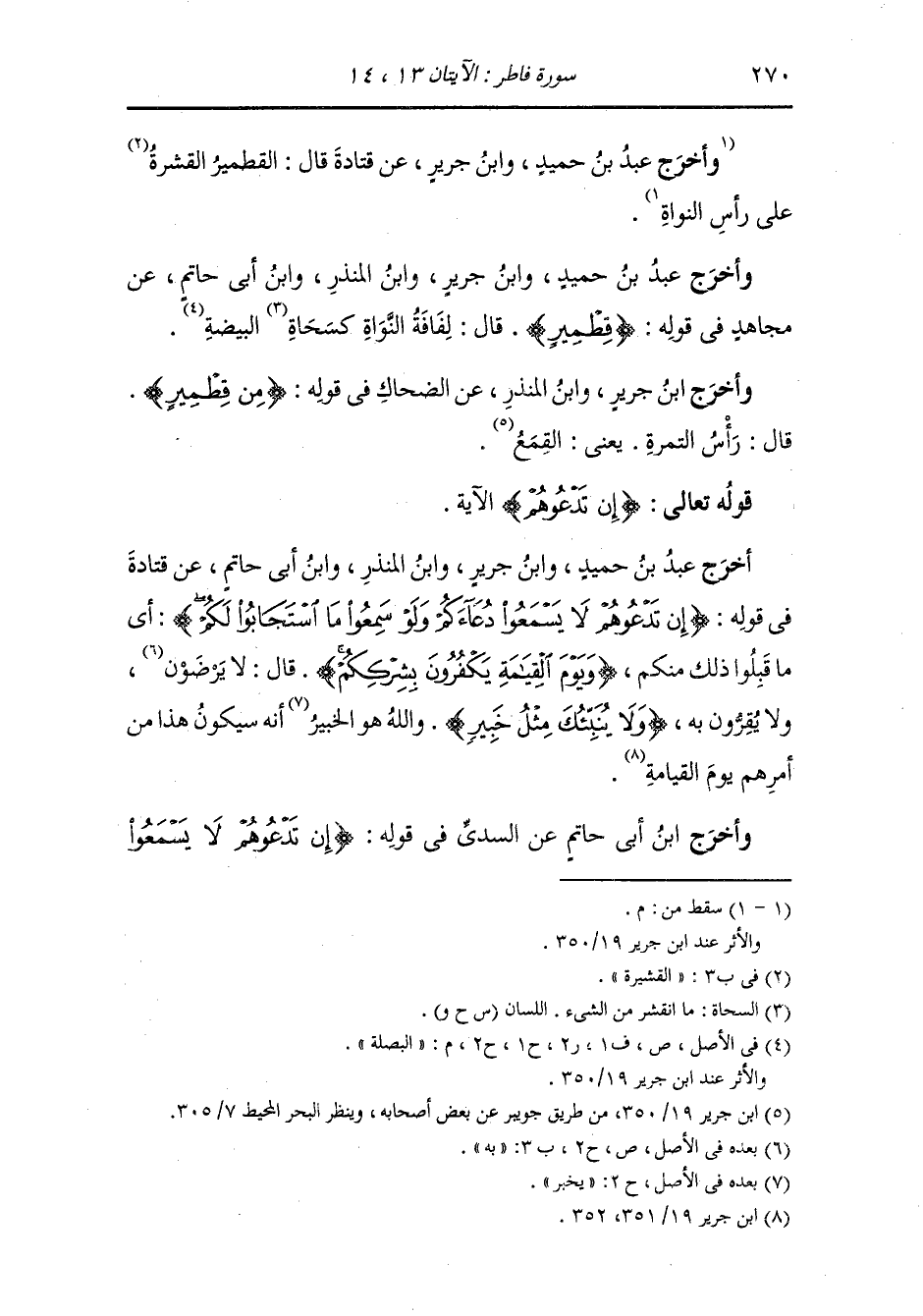 وأخرج سعيد بن منصور ، وعَبد بن حُمَيد ، وَابن جَرِير ، وَابن المنذر ، وَابن أبي حاتم عن ابن عباس في قوله {ما يملكون من قطمير} قال : القطمير القشر وفي لفظ الجلد الذي يكون على ظهر النواة.