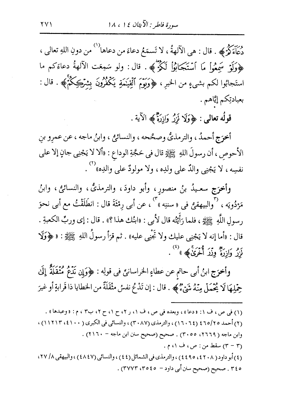 أَخرَج عَبد بن حُمَيد ، وَابن جَرِير ، وَابن المنذر ، وَابن أبي حاتم عن قتادة في قوله {إن تدعوهم لا يسمعوا دعاءكم ولو سمعوا ما استجابوا لكم} أي ما قبلوا ذلك منكم {ويوم القيامة يكفرون بشرككم} قال : لا يرضون ولا يقرون به {ولا ينبئك مثل خبير} والله هو الخبير أنه سيكون هذا من أمرهم يوم القيامة.