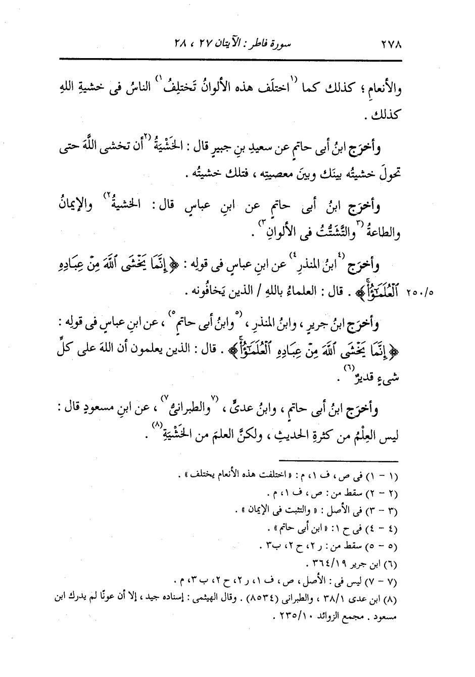 وأخرج ابن أبي شيبه ، وعَبد بن حُمَيد ، وَابن المنذر ، وَابن أبي حاتم عن أبي مالك رضي الله عنه في قوله {ومن الجبال جدد} قال : طرائق تكون في الجبل بيض وحمر فتلك الجدد {وغرابيب سود} قال : جبال سود {ومن الناس والدواب والأنعام} ، قال : كذلك اختلاف الناس والدواب والأنعام كاختلاف الجبال ، ثم قال {إنما يخشى الله من عباده العلماء} فلا فضل لما قبلها.