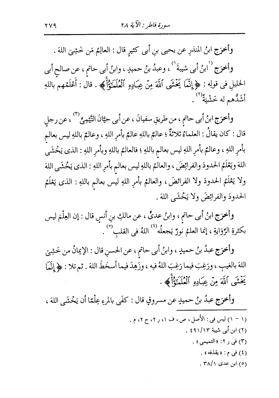 وأخرج ابن جرير ، وَابن المنذر ، وَابن أبي حاتم عن ابن عباس رضي الله عنهما في قوله {إنما يخشى الله من عباده العلماء} قال : الذين يعلمون أن الله على كل شيء قدير.
