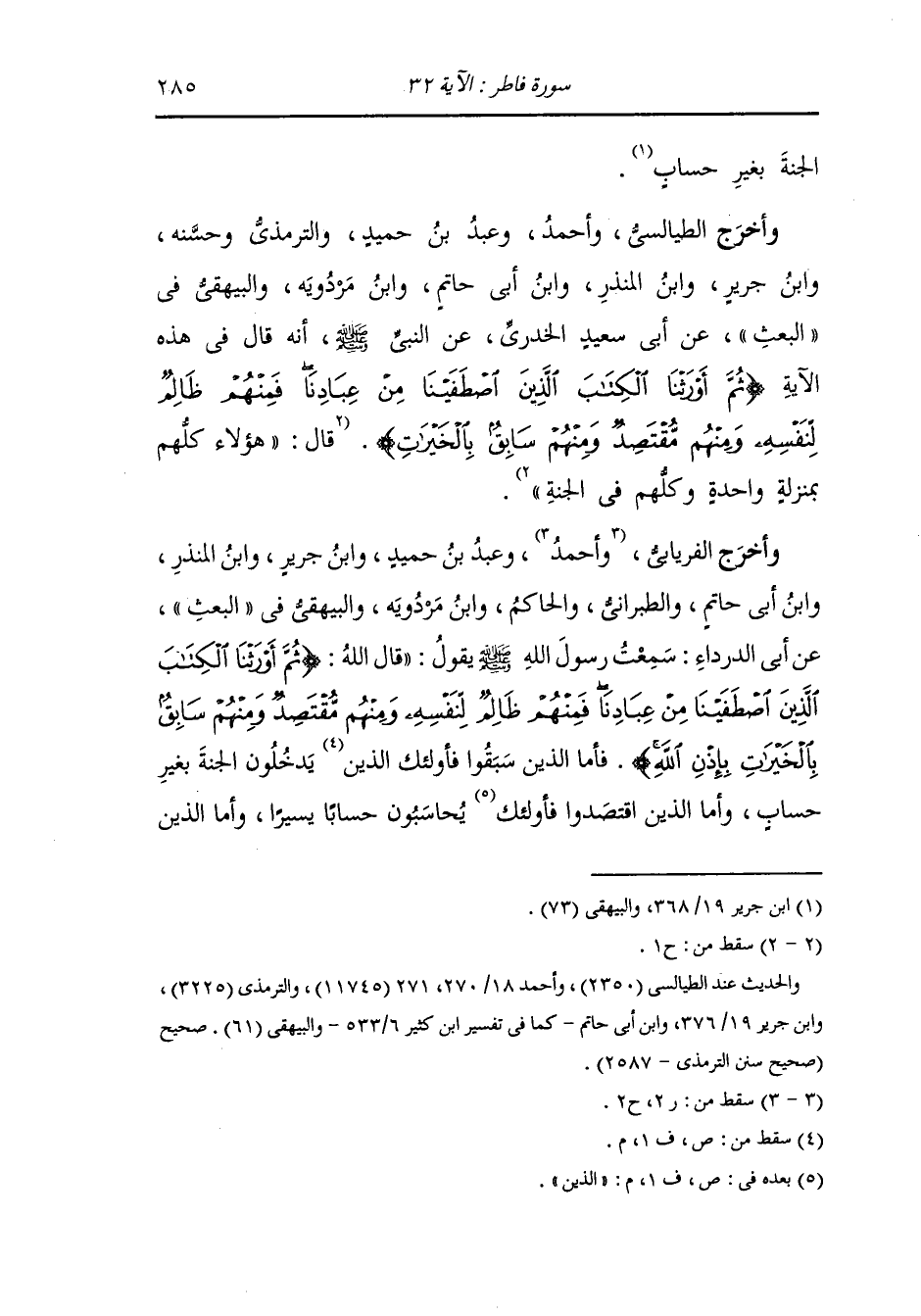 أَخْرَج ابن جرير ، وَابن المنذر ، وَابن أبي حاتم ، وَابن مردويه والبيهقي في البعث عن ابن عباس في قوله {ثم أورثنا الكتاب الذين اصطفينا من عبادنا} قال : هم أمة محمد صلى الله عليه وسلم ، ورثهم الله كل كتاب أنزل فظالمهم مغفور له ومقتصدهم يحاسب حسابا يسيرا وسابقهم يدخل