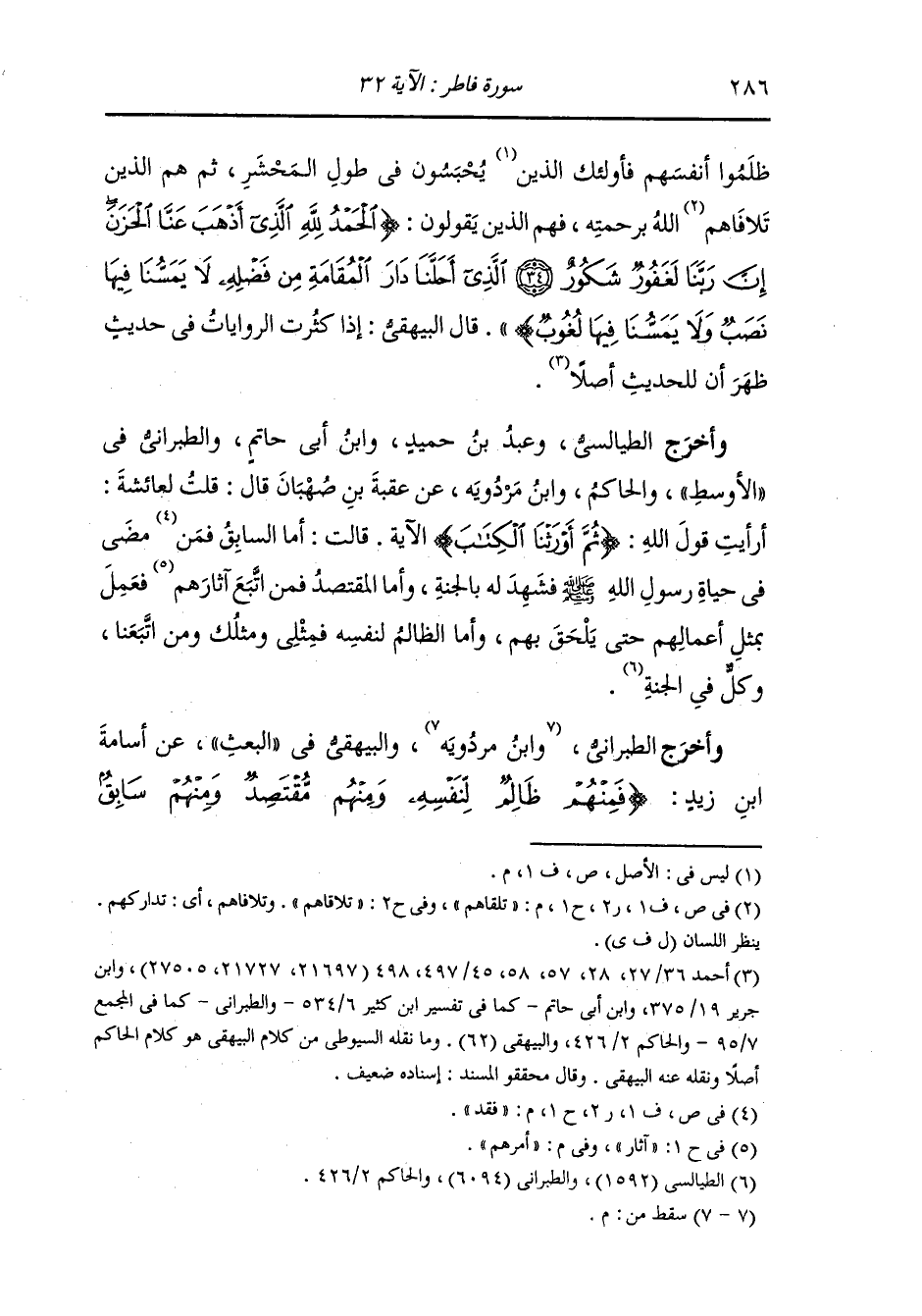وأخرج الفريابي وأحمد ، وعَبد بن حُمَيد ، وَابن جَرِير ، وَابن المنذر ، وَابن أبي حاتم والطبراني والحاكم ، وَابن مردويه والبيهقي عن أبي الدرداء : سمعت رسول الله صلى الله عليه وسلم يقول قال الله تعالى {ثم أورثنا الكتاب الذين اصطفينا من عبادنا فمنهم ظالم لنفسه ومنهم مقتصد ومنهم سابق بالخيرات بإذن الله} فأما الذين سبقوا فأولئك يدخلون الجنة بغير حساب.