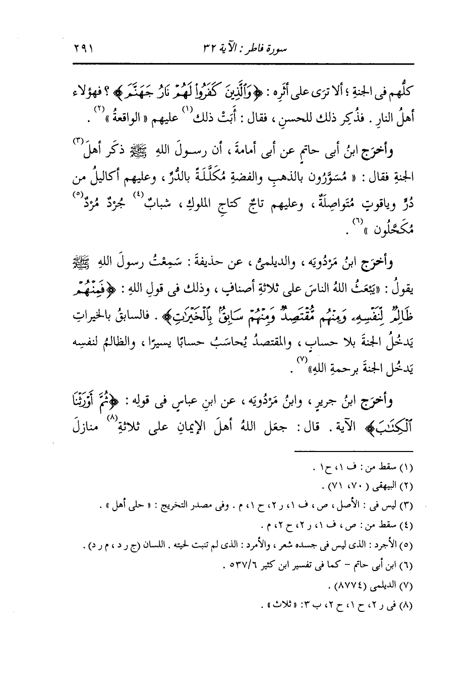 وأخرج الفريابي ، وعَبد بن حُمَيد عن ابن عباس في قوله {ثم أورثنا الكتاب} ، قال : هي مثل الذي في الواقعة (فأصحاب الميمنة) (وأصحاب المشئمة) (والسابقون) صنفان ناجيان وصنف هالك.