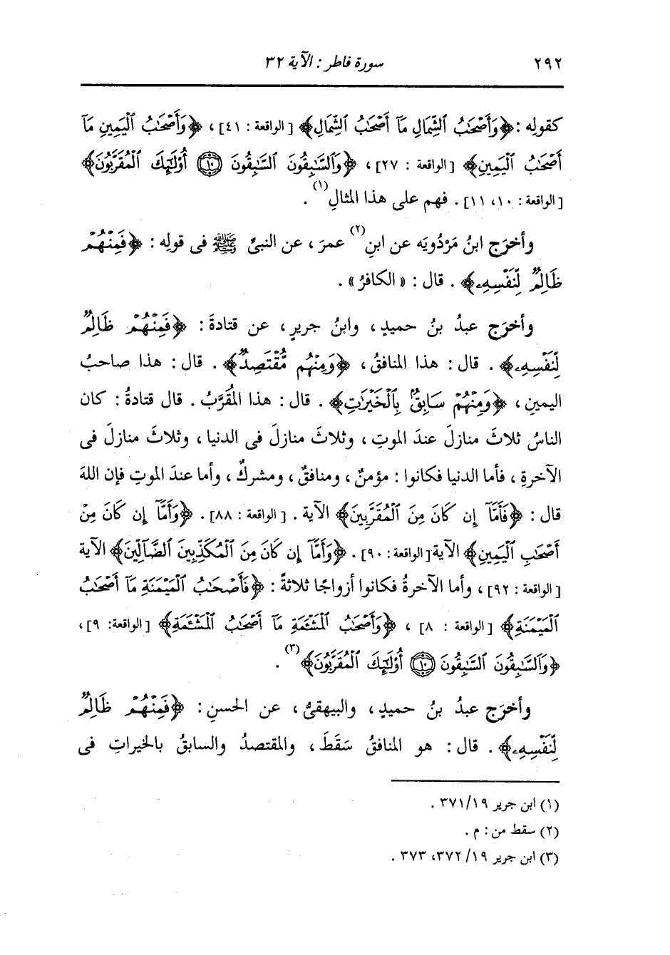 وأخرج ابن جرير ، وَابن مردويه عن ابن عباس في قوله {ثم أورثنا الكتاب} قال : جعل الله أهل الإيمان على ثلاثة منازل